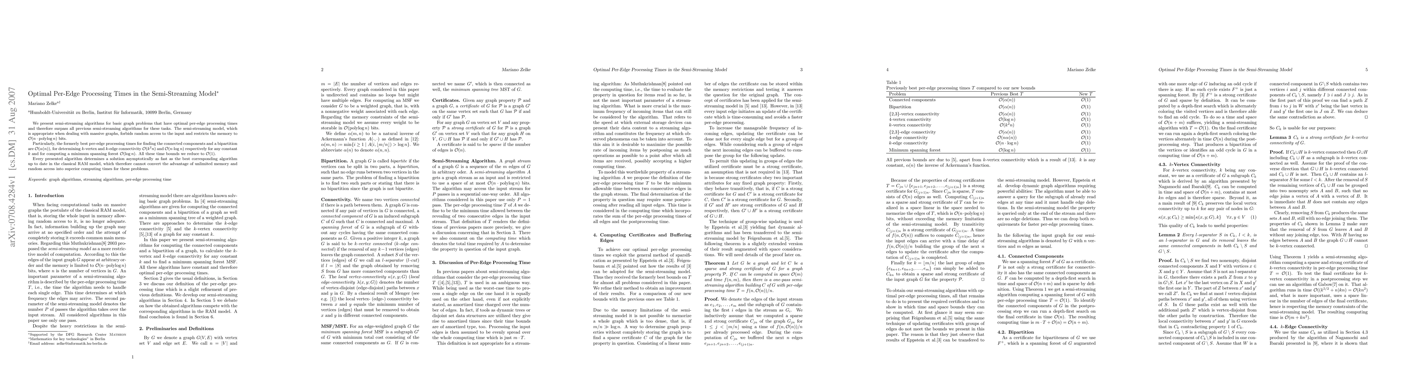 This paper introduces semi-streaming algorithms achieving optimal per-edge processing times for fundamental graph problems, reducing previously best times to O(1) and surpassing all prior algorithms in the semi-streaming model. These improvements are significant for massive graph processing with limited memory constraints.