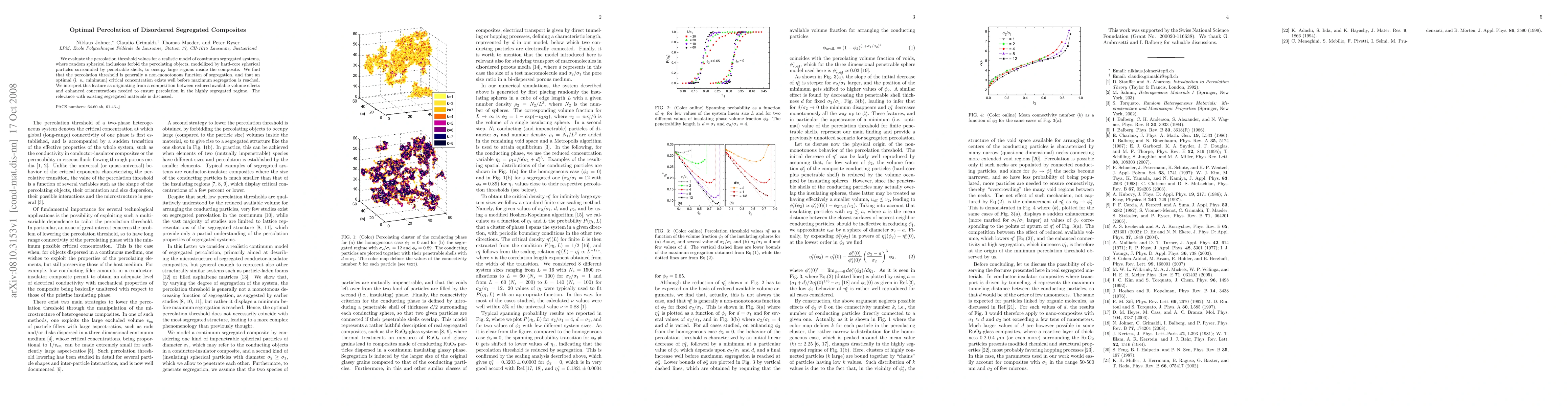 This paper investigates percolation thresholds in disordered segregated composites, finding that an optimal critical concentration exists before maximum segregation, due to a balance between reduced available volume and enhanced concentration effects. The results have implications for understanding segregated materials.