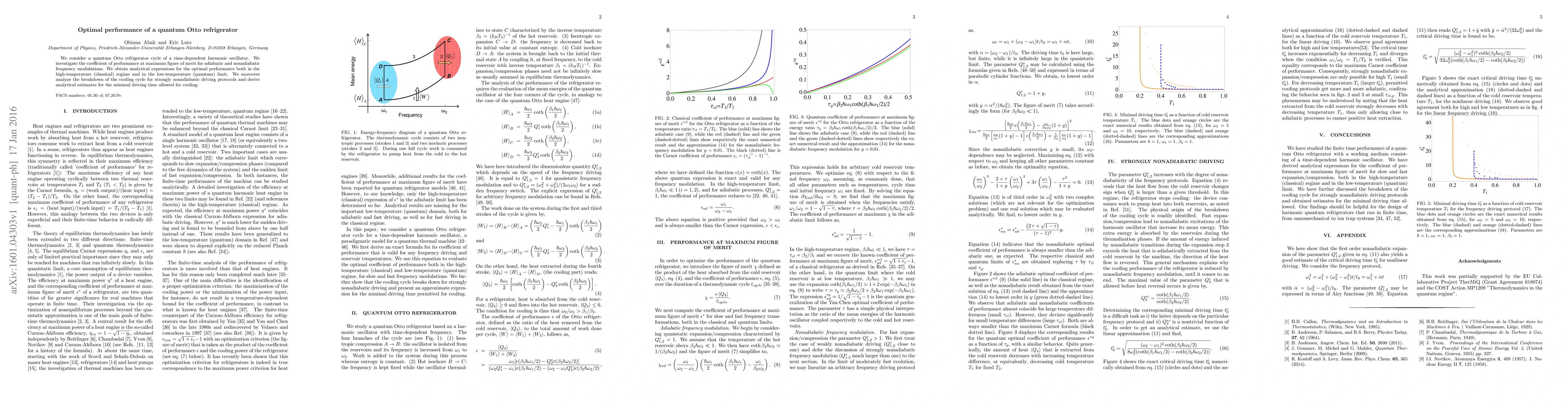 This paper explores the optimal performance of a quantum Otto refrigerator using a time-dependent harmonic oscillator, deriving analytical expressions for maximum efficiency in both classical and quantum regimes. It also examines the failure of cooling under strongly nonadiabatic conditions and provides estimates for the minimum driving time required for effective refrigeration.