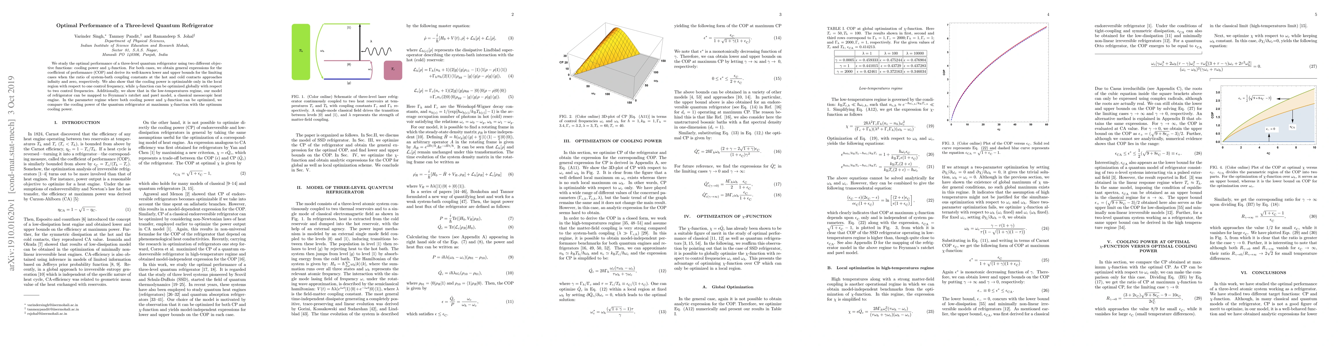 This paper investigates the optimal performance of a three-level quantum refrigerator, deriving expressions for its coefficient of performance (COP) under cooling power and $\chi$-function objectives. It finds that cooling power is locally optimizable, while $\chi$-function is globally optimizable, and compares the refrigerator's performance in the low-temperature regime to Feynman's ratchet and pawl model.