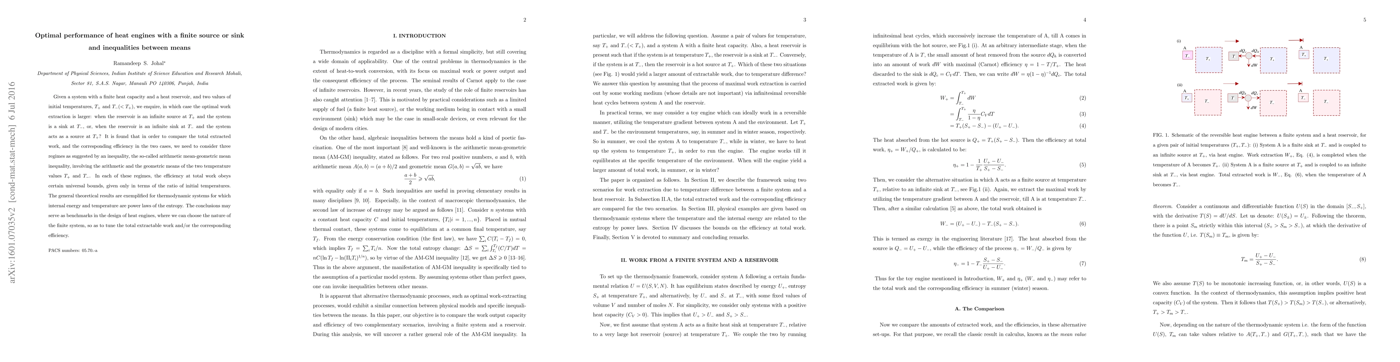 Given a system with a finite heat capacity and a heat reservoir, and two values of initial temperatures, $T_+$ and $T_- (< T_+)$, we enquire, in which case the optimal work extraction is larger: when the reservoir is an infinite source at $T_+$ and the system is a sink at $T_-$, or, when the reservoir is an infinite sink at $T_-$ and the system acts as a source at $T_+$? It is found that in order to compare the total extracted work, and the corresponding efficiency in the two cases, we need to consider three regimes as suggested by an inequality, the so-called arithmetic mean-geometric mean inequality, involving the arithmetic and the geometric means of the two temperature values $T_+$ and $T_-$. In each of these regimes, the efficiency at total work obeys certain universal bounds, given only in terms of the ratio of initial temperatures. The general theoretical results are exemplified for thermodynamic systems for which internal energy and temperature are power laws of the entropy. The conclusions may serve as benchmarks in the design of heat engines, where we can choose the nature of the finite system, so as to tune the total extractable work and/or the corresponding efficiency.