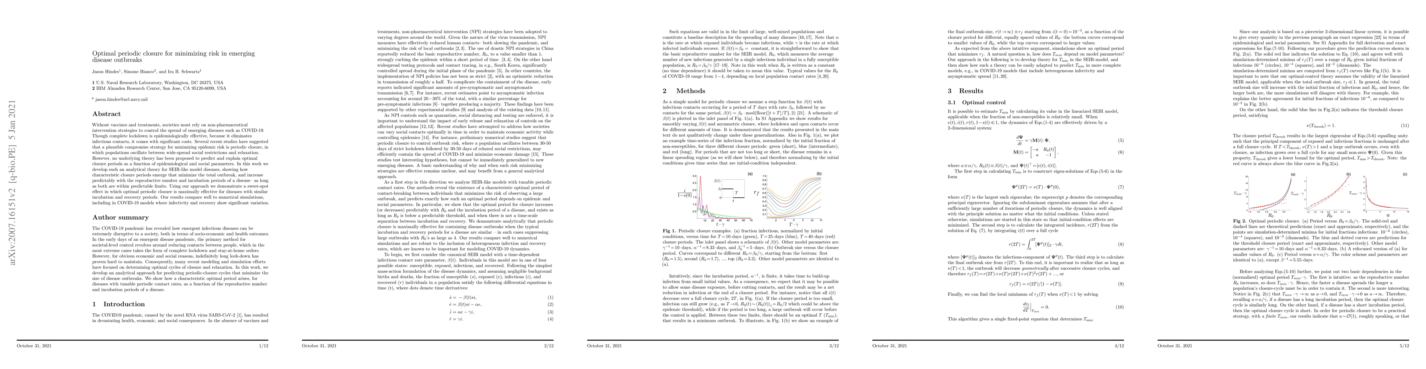 Without vaccines and treatments, societies must rely on non-pharmaceutical intervention strategies to control the spread of emerging diseases such as COVID-19. Though complete lockdown is epidemiologically effective, because it eliminates infectious contacts, it comes with significant costs. Several recent studies have suggested that a plausible compromise strategy for minimizing epidemic risk is periodic closure, in which populations oscillate between wide-spread social restrictions and relaxation. However, no underlying theory has been proposed to predict and explain optimal closure periods as a function of epidemiological and social parameters. In this work we develop such an analytical theory for SEIR-like model diseases, showing how characteristic closure periods emerge that minimize the total outbreak, and increase predictably with the reproductive number and incubation periods of a disease, as long as both are within predictable limits. Using our approach we demonstrate a sweet-spot effect in which optimal periodic closure is maximally effective for diseases with similar incubation and recovery periods. Our results compare well to numerical simulations, including in COVID-19 models where infectivity and recovery show significant variability.