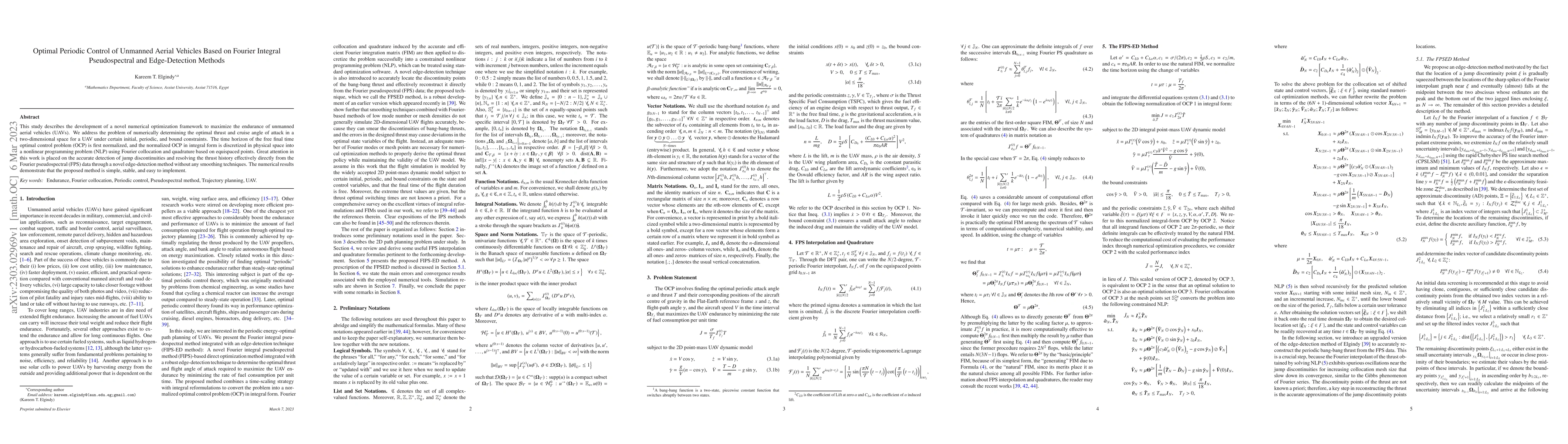 This study describes the development of a novel numerical optimization framework to maximize the endurance of unmanned aerial vehicles (UAVs). We address the problem of numerically determining the optimal thrust and cruise angle of attack in a two-dimensional space for a UAV under certain initial, periodic, and bound constraints. The time horizon of the free final time optimal control problem (OCP) is first normalized, and the normalized OCP in integral form is discretized in physical space into a nonlinear programming problem (NLP) using Fourier collocation and quadrature based on equispaced points. Great attention in this work is placed on the accurate detection of jump discontinuities and resolving the thrust history effectively directly from the Fourier pseudospectral (FPS) data through a novel edge-detection method without any smoothing techniques. The numerical results demonstrate that the proposed method is simple, stable, and easy to implement.