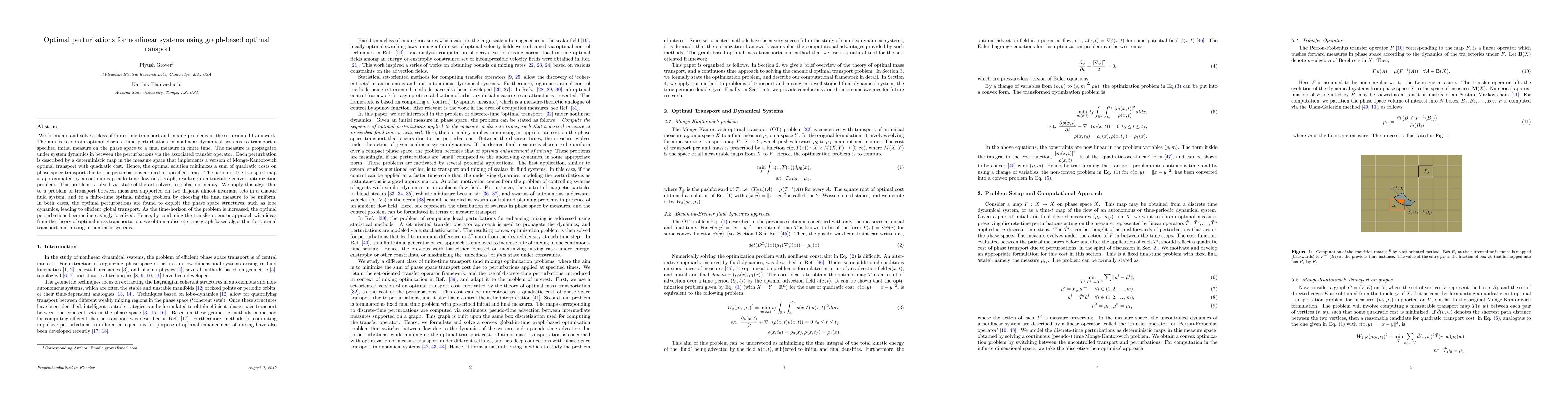 This paper develops a graph-based optimal transport algorithm to find optimal discrete-time perturbations in nonlinear dynamical systems for transporting initial measures to final measures in finite time. The method combines transfer operator dynamics and Monge-Kantorovich optimal transport, solved via convex optimization, and is applied to transport problems in chaotic fluid systems and optimal mixing.