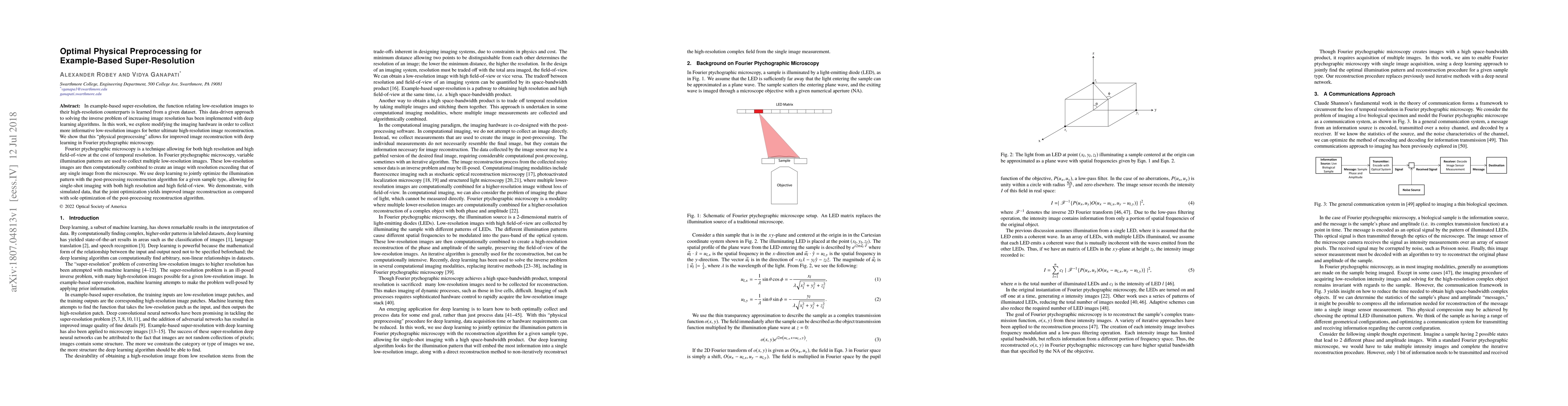 In example-based super-resolution, the function relating low-resolution images to their high-resolution counterparts is learned from a given dataset. This data-driven approach to solving the inverse problem of increasing image resolution has been implemented with deep learning algorithms. In this work, we explore modifying the imaging hardware in order to collect more informative low-resolution images for better ultimate high-resolution image reconstruction. We show that this "physical preprocessing" allows for improved image reconstruction with deep learning in Fourier ptychographic microscopy. Fourier ptychographic microscopy is a technique allowing for both high resolution and high field-of-view at the cost of temporal resolution. In Fourier ptychographic microscopy, variable illumination patterns are used to collect multiple low-resolution images. These low-resolution images are then computationally combined to create an image with resolution exceeding that of any single image from the microscope. We use deep learning to jointly optimize the illumination pattern with the post-processing reconstruction algorithm for a given sample type, allowing for single-shot imaging with both high resolution and high field-of-view. We demonstrate, with simulated data, that the joint optimization yields improved image reconstruction as compared with sole optimization of the post-processing reconstruction algorithm.