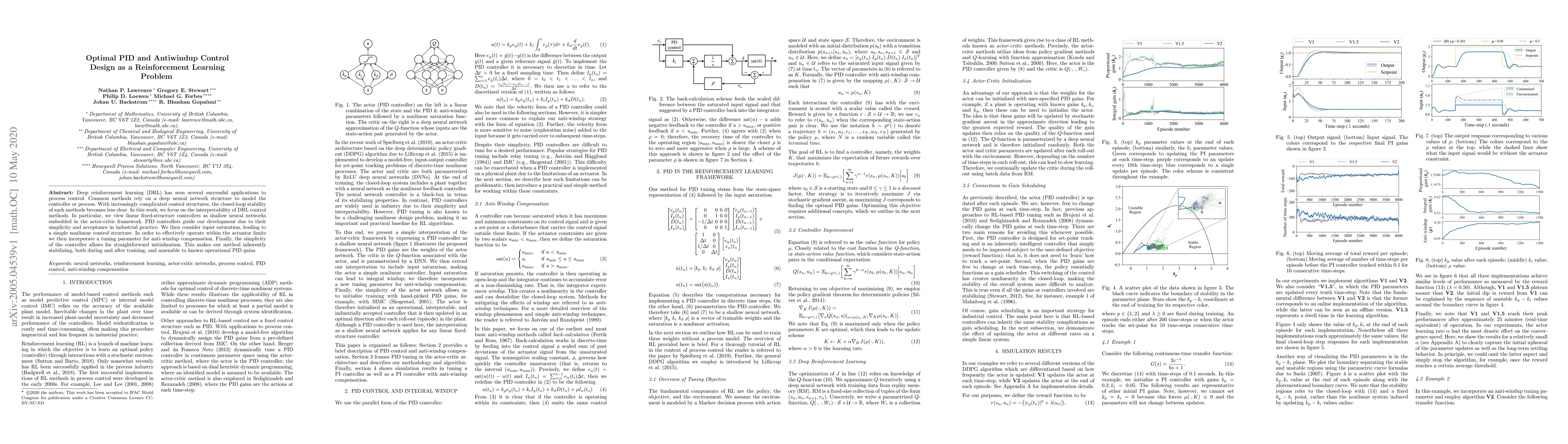 This paper explores the use of deep reinforcement learning to design optimal PID controllers with anti-windup for process control, framing linear fixed-structure controllers as shallow neural networks within the actor-critic framework. It addresses input saturation through anti-windup compensation, ensuring stability and operational PID gains.