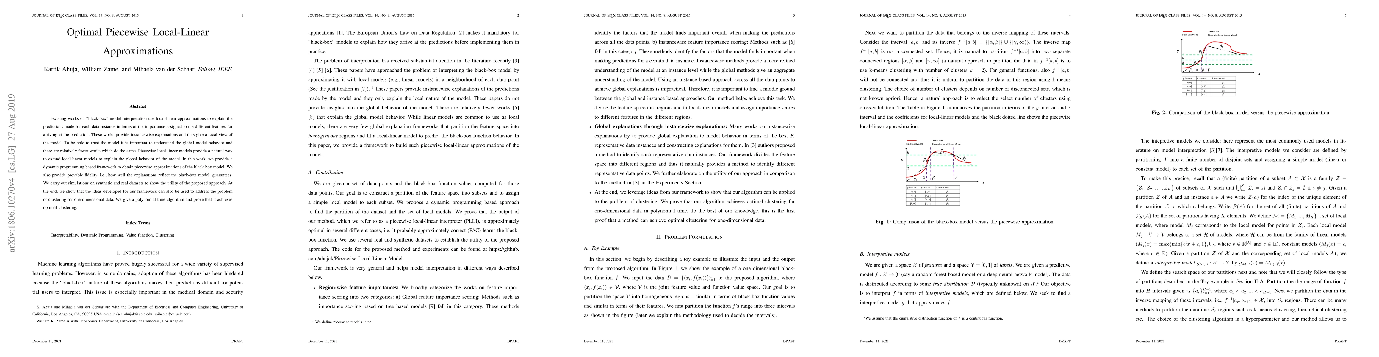 Existing works on "black-box" model interpretation use local-linear approximations to explain the predictions made for each data instance in terms of the importance assigned to the different features for arriving at the prediction. These works provide instancewise explanations and thus give a local view of the model. To be able to trust the model it is important to understand the global model behavior and there are relatively fewer works which do the same. Piecewise local-linear models provide a natural way to extend local-linear models to explain the global behavior of the model. In this work, we provide a dynamic programming based framework to obtain piecewise approximations of the black-box model. We also provide provable fidelity, i.e., how well the explanations reflect the black-box model, guarantees. We carry out simulations on synthetic and real datasets to show the utility of the proposed approach. At the end, we show that the ideas developed for our framework can also be used to address the problem of clustering for one-dimensional data. We give a polynomial time algorithm and prove that it achieves optimal clustering.