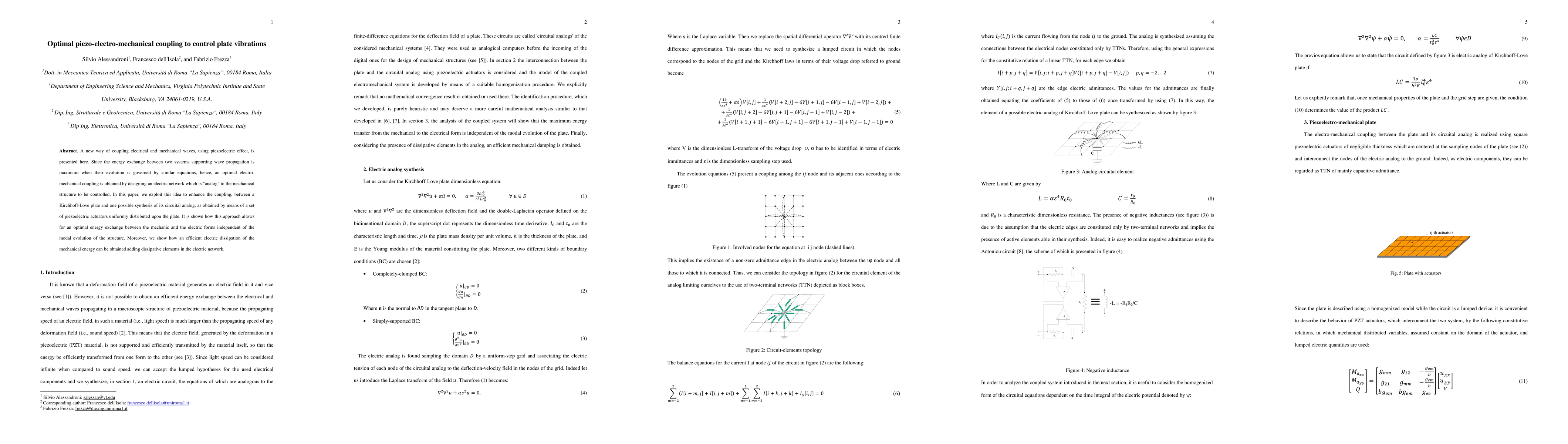 This paper introduces an optimal piezo-electro-mechanical coupling method to control plate vibrations by designing an electric network analogous to the mechanical structure. The approach maximizes energy exchange between the mechanical and electrical systems, achieving efficient dissipation of mechanical energy through the electric network.