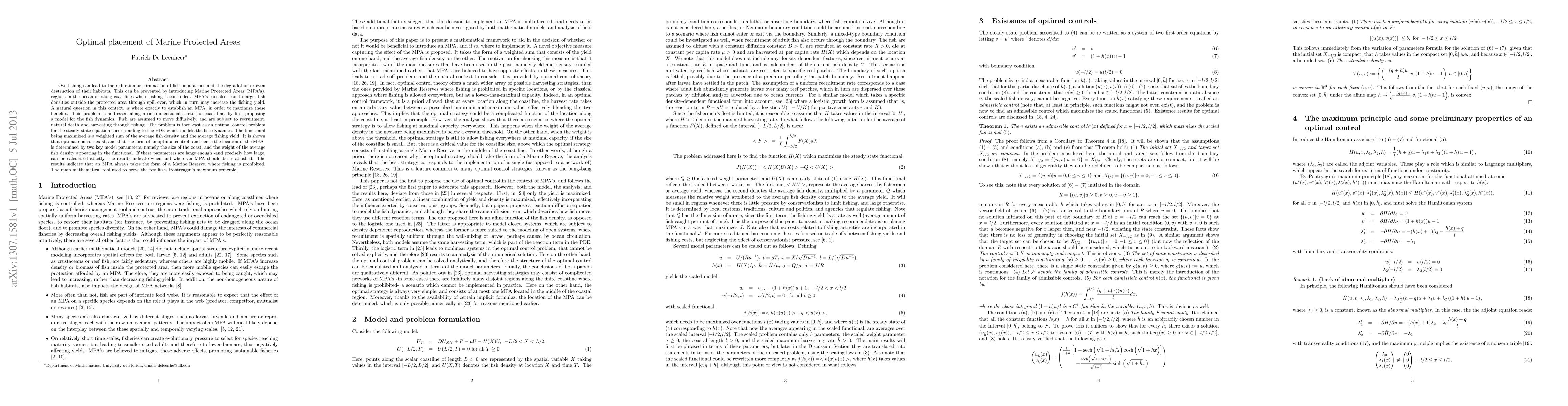 This paper proposes a model to determine the optimal placement of Marine Protected Areas (MPAs) along a coastal line to maximize fish density and fishing yield. Using Pontryagin's maximum principle, it finds that optimal MPA locations are determined by the coast size and the weight of fish density, leading to the establishment of Marine Reserves where fishing is prohibited.