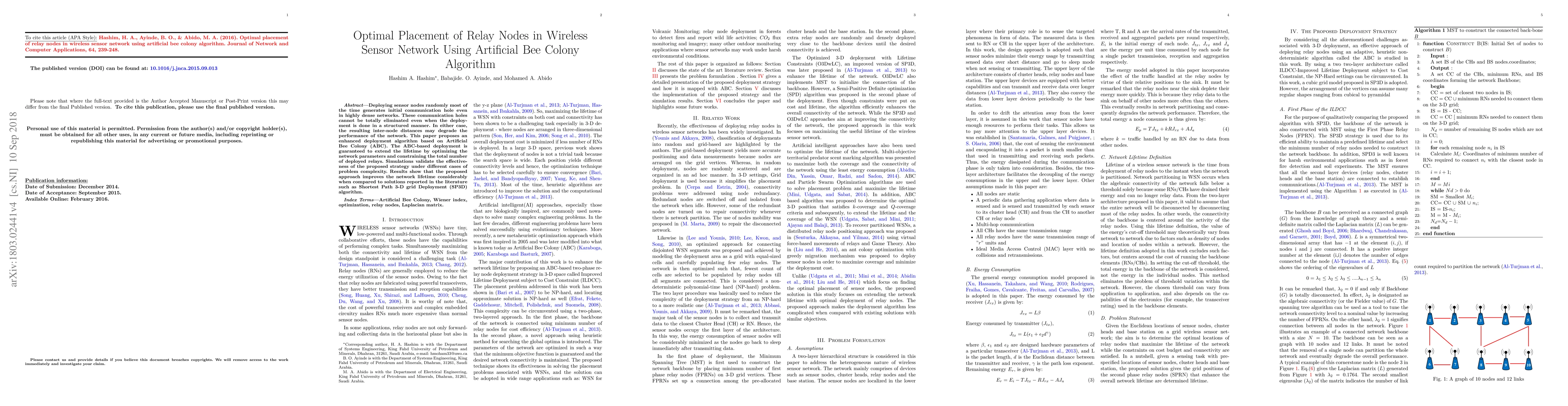 Deploying sensor nodes randomly most of the time generates initial communication hole even in highly dense networks. These communication holes cannot be totally eliminated even when the deployment is done in a structured manner. In either case, the resulting inter-node distances may degrade the performance of the network. This paper proposes an enhanced deployment algorithm based on Artificial Bees Colony (ABC). The ABC-based deployment is guaranteed to extend the lifetime by optimizing the network parameters and constraining the total number of deployed relays. Simulations validate the effectiveness of the proposed strategy under different cases of problem complexity. Results show that the proposed approach improves the network lifetime considerably when compared to solutions reported in the literature such as Shortest Path 3-D grid Deployment (SP3D) algorithm. Keywords: Artificial Bee Colony, Wiener index, optimization, relay nodes, Laplacian matrix, connected graph, vertex, edge, average distance, Laplacian matrix, Shortest Path 3-D grid Deployment, ABC, SP3D, RNs/CHs, ILDCC, SPRN, O3DwLC, algorithm, approach, single objective, multi objective, eigenvalue, First Phase Relay Nodes, NP-Hard, Deployment, proposed, second phase relay nodes, Ideal Media Access Control, cluster head, Minimum Spanning Tree, non-deterministic polynomial-time hard, two-layer hierarchical structure, Optimized 3-D deployment with Lifetime Constraints, flux, Wireless Sensor Network, size, Lifetime, Network load, number of nodes using packets, Connectivity, two layered, protocols, collision and interference.