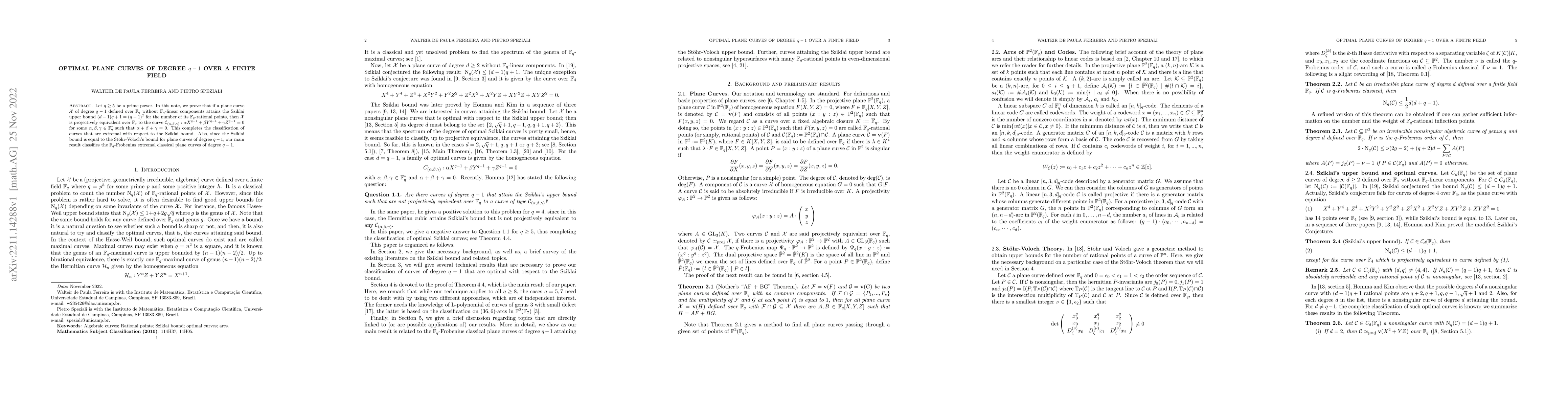 This paper classifies plane curves of degree $q-1$ over a finite field $\mathbb{F}_q$ that reach the Sziklai upper bound for $\mathbb{F}_q$-rational points, showing they are equivalent to a specific form. It completes the classification of extremal curves with respect to this bound.