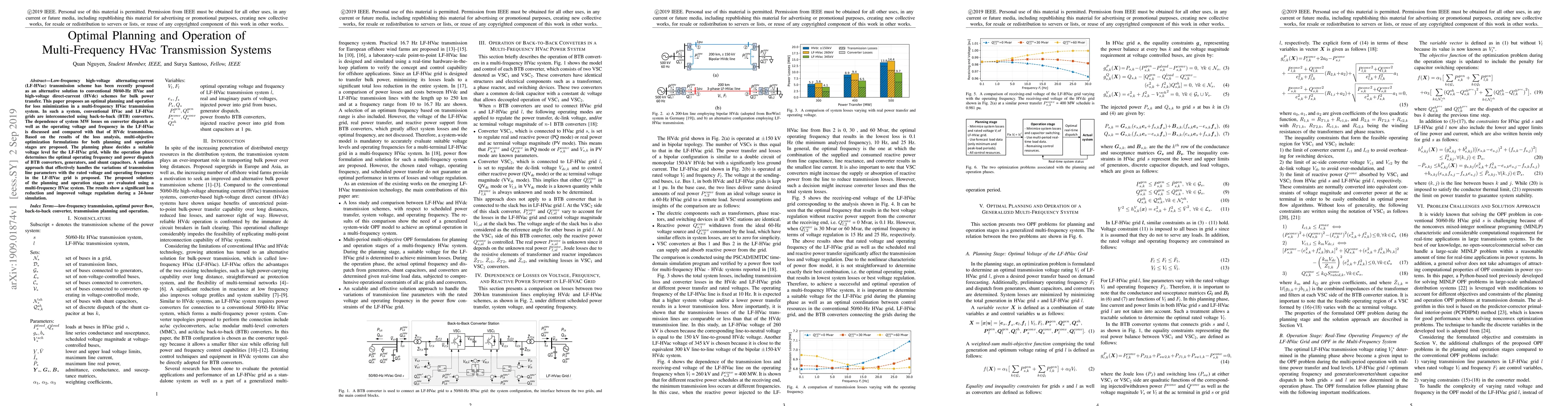 This paper proposes an optimal planning and operation strategy for multi-frequency HVac transmission systems to minimize losses, comparing LF-HVac with HVdc. The study introduces multi-objective optimization for both planning and operational stages, demonstrating significant loss reduction and improved voltage regulation in simulations.