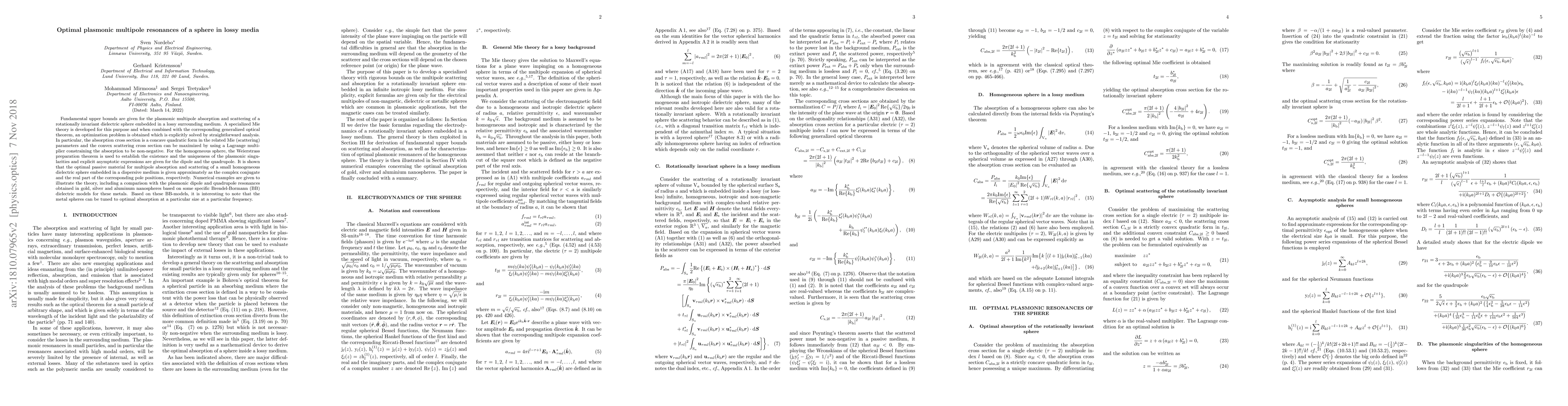 Fundamental upper bounds are given for the plasmonic multipole absorption and scattering of a rotationally invariant dielectric sphere embedded in a lossy surrounding medium. A specialized Mie theory is developed for this purpose and when combined with the corresponding generalized optical theorem, an optimization problem is obtained which is explicitly solved by straightforward analysis. In particular, the absorption cross section is a concave quadratic form in the related Mie (scattering) parameters and the convex scattering cross section can be maximized by using a Lagrange multiplier constraining the absorption to be non-negative. For the homogeneous sphere, the Weierstrass preparation theorem is used to establish the existence and the uniqueness of the plasmonic singularities and explicit asymptotic expressions are given for the dipole and the quadrupole. It is shown that the optimal passive material for multipole absorption and scattering of a small homogeneous dielectric sphere embedded in a dispersive medium is given approximately as the complex conjugate and the real part of the corresponding pole positions, respectively. Numerical examples are given to illustrate the theory, including a comparison with the plasmonic dipole and quadrupole resonances obtained in gold, silver and aluminum nanospheres based on some specific Brendel-Bormann (BB) dielectric models for these metals. % of gold, silver and aluminum. Based on these BB-models, it is interesting to note that the metal spheres can be tuned to optimal absorption at a particular size at a particular frequency.
