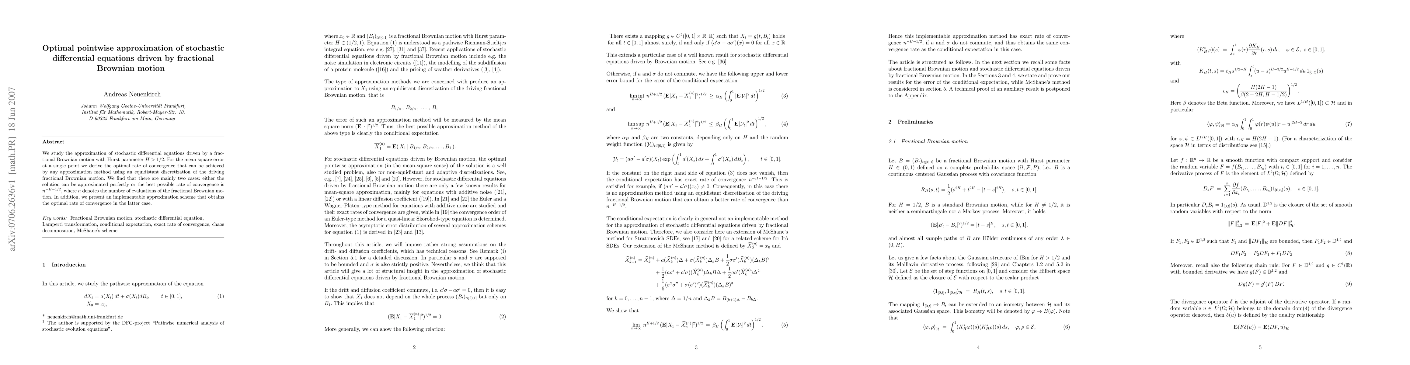 This paper investigates optimal pointwise approximation methods for stochastic differential equations driven by fractional Brownian motion with $H > 1/2$. It derives the best achievable mean-square error convergence rate for equidistant discretizations, showing two scenarios: perfect approximation or a convergence rate of $n^{-H-1/2}$, and presents an implementable scheme achieving the optimal rate in the latter case.