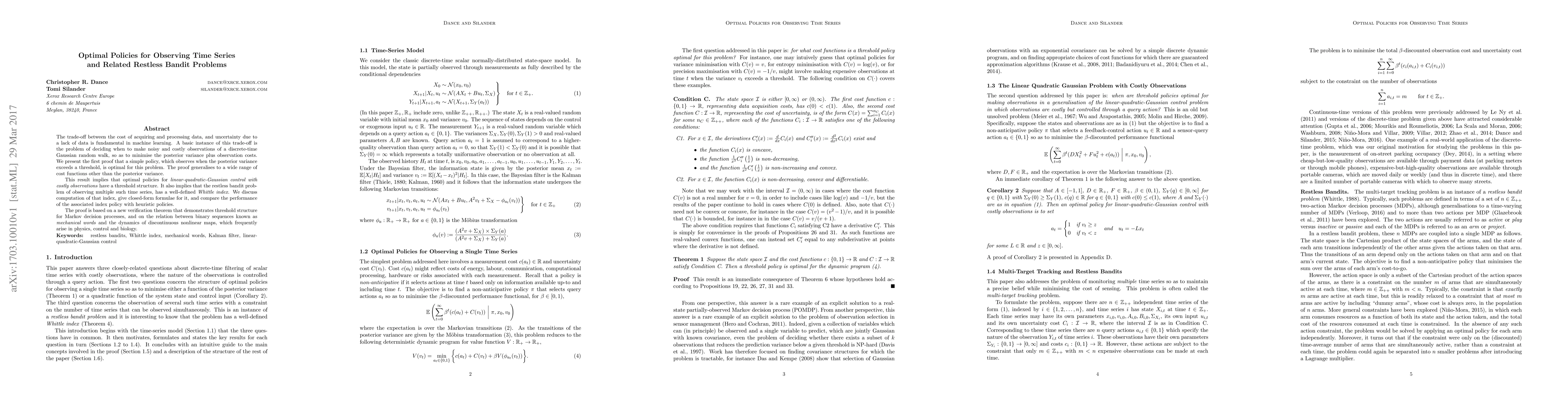 The trade-off between the cost of acquiring and processing data, and uncertainty due to a lack of data is fundamental in machine learning. A basic instance of this trade-off is the problem of deciding when to make noisy and costly observations of a discrete-time Gaussian random walk, so as to minimise the posterior variance plus observation costs. We present the first proof that a simple policy, which observes when the posterior variance exceeds a threshold, is optimal for this problem. The proof generalises to a wide range of cost functions other than the posterior variance. This result implies that optimal policies for linear-quadratic-Gaussian control with costly observations have a threshold structure. It also implies that the restless bandit problem of observing multiple such time series, has a well-defined Whittle index. We discuss computation of that index, give closed-form formulae for it, and compare the performance of the associated index policy with heuristic policies. The proof is based on a new verification theorem that demonstrates threshold structure for Markov decision processes, and on the relation between binary sequences known as mechanical words and the dynamics of discontinuous nonlinear maps, which frequently arise in physics, control and biology.