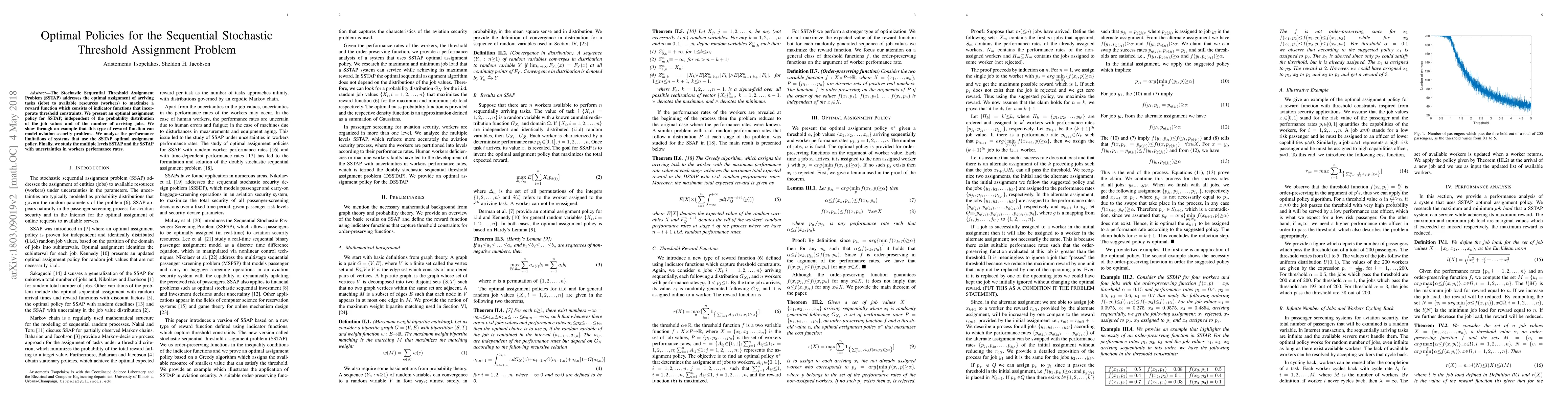 The Stochastic Sequential Threshold Assignment Problem (SSTAP) addresses the optimal assignment of arriving tasks (jobs) to available resources (workers) to maximize a reward function which consists of indicator functions that incorporate threshold constraints. We present an optimal assignment policy for SSTAP, independent of the probability distribution of the job values and of the number of arriving jobs. We show through an example that this type of reward function can model aviation security problems. We analyze the performance limitations of systems that use the SSTAP optimal assignment policy. Finally, we study the multiple levels SSTAP and the SSTAP with uncertainties in workers performance rates.