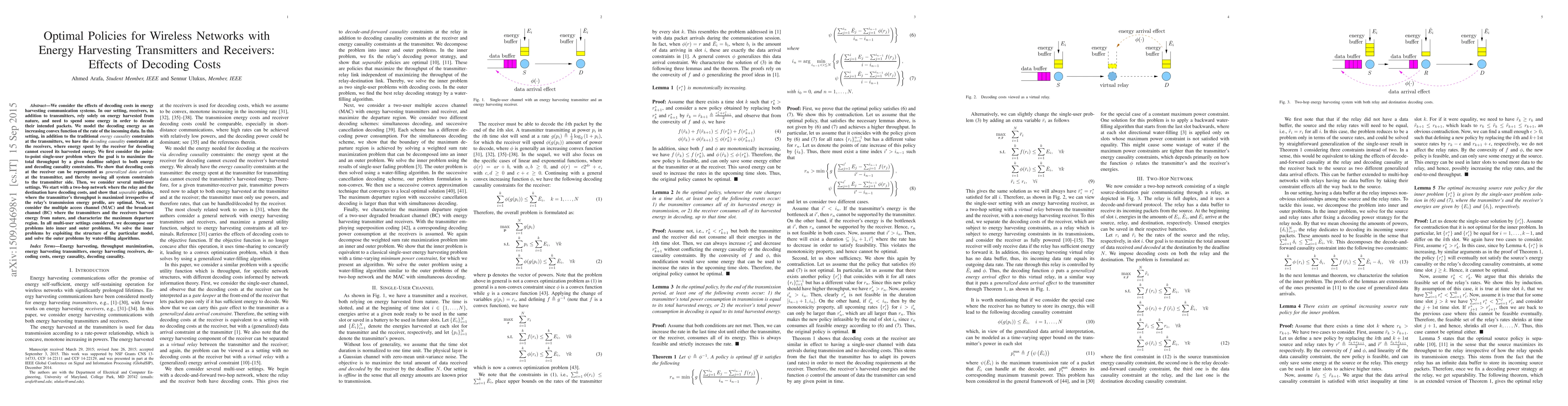 This paper investigates optimal policies for wireless networks where both transmitters and receivers rely on energy harvesting and incur decoding costs. It models decoding energy as a convex function of data rate and considers both energy and decoding causality constraints, showing that decoding costs can be represented as generalized data arrivals at the transmitter. The study finds optimal separable policies for multi-user settings like two-hop networks, multiple access channels, and broadcast channels, using decomposition and water-filling algorithms.
