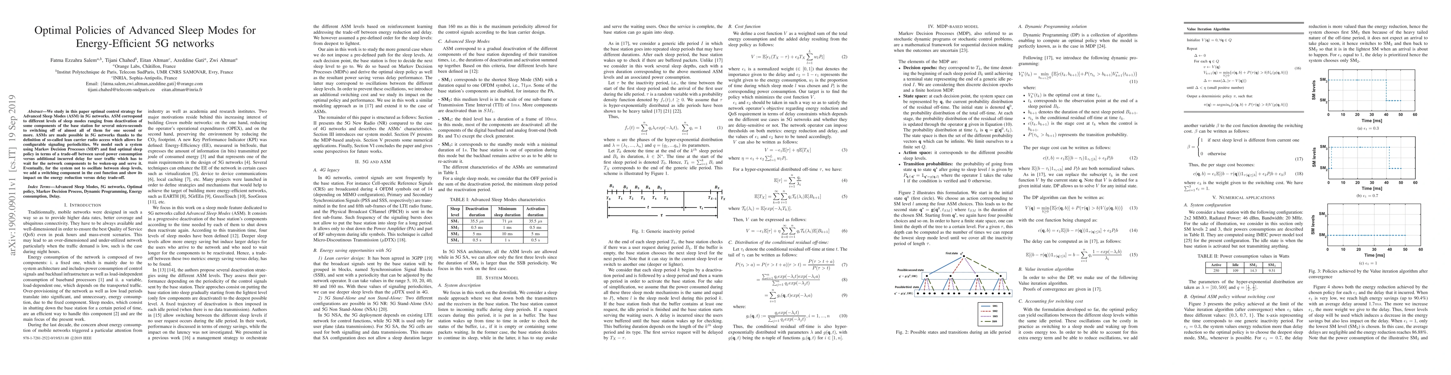 We study in this paper optimal control strategy for Advanced Sleep Modes (ASM) in 5G networks. ASM correspond to different levels of sleep modes ranging from deactivation of some components of the base station for several micro-seconds to switching off of almost all of them for one second or more. ASMs are made possible in 5G networks thanks to the definition of so-called lean carrier radio access which allows for configurable signaling periodicities. We model such a system using Markov Decision Processes (MDP) and find optimal sleep policy in terms of a trade-off between saved power consumption versus additional incurred delay for user traffic which has to wait for the network components to be woken-up and serve it. Eventually, for the system not to oscillate between sleep levels, we add a switching component in the cost function and show its impact on the energy reduction versus delay trade-off.