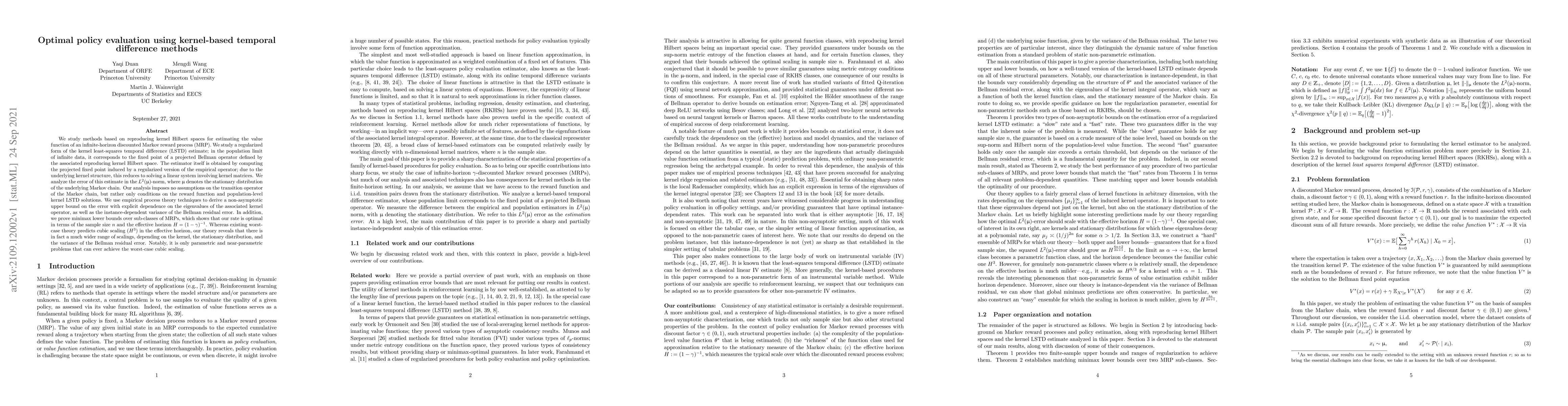 We study methods based on reproducing kernel Hilbert spaces for estimating the value function of an infinite-horizon discounted Markov reward process (MRP). We study a regularized form of the kernel least-squares temporal difference (LSTD) estimate; in the population limit of infinite data, it corresponds to the fixed point of a projected Bellman operator defined by the associated reproducing kernel Hilbert space. The estimator itself is obtained by computing the projected fixed point induced by a regularized version of the empirical operator; due to the underlying kernel structure, this reduces to solving a linear system involving kernel matrices. We analyze the error of this estimate in the $L^2(\mu)$-norm, where $\mu$ denotes the stationary distribution of the underlying Markov chain. Our analysis imposes no assumptions on the transition operator of the Markov chain, but rather only conditions on the reward function and population-level kernel LSTD solutions. We use empirical process theory techniques to derive a non-asymptotic upper bound on the error with explicit dependence on the eigenvalues of the associated kernel operator, as well as the instance-dependent variance of the Bellman residual error. In addition, we prove minimax lower bounds over sub-classes of MRPs, which shows that our rate is optimal in terms of the sample size $n$ and the effective horizon $H = (1 - \gamma)^{-1}$. Whereas existing worst-case theory predicts cubic scaling ($H^3$) in the effective horizon, our theory reveals that there is in fact a much wider range of scalings, depending on the kernel, the stationary distribution, and the variance of the Bellman residual error. Notably, it is only parametric and near-parametric problems that can ever achieve the worst-case cubic scaling.