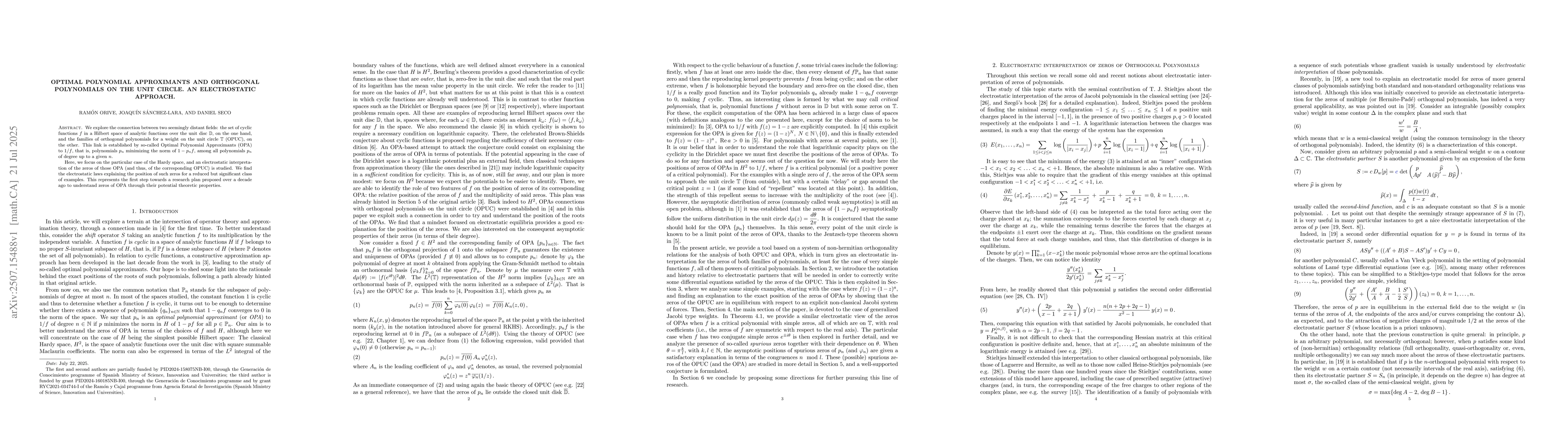 We explore the connection between two seemingly distant fields: the set of cyclic functions $f$ in a Hilbert space of analytic functions over the unit disc $\D$, on the one hand, and the families of orthogonal polynomials for a weight on the unit circle $\T$ (OPUC), on the other. This link is established by so-called Optimal Polynomial Approximants (OPA) to $1/f$, that is, polynomials $p_n$ minimizing the norm of $1-p_nf$, among all polynomials $p_n$ of degree up to a given $n$. Here, we focus on the particular case of the Hardy space, and an electrostatic interpretation of the zeros of those OPA (and thus, of the corresponding OPUC) is studied. We find the electrostatic laws explaining the position of such zeros for a reduced but significant class of examples. This represents the first step towards a research plan proposed over a decade ago to understand zeros of OPA through their potential theoretic properties.