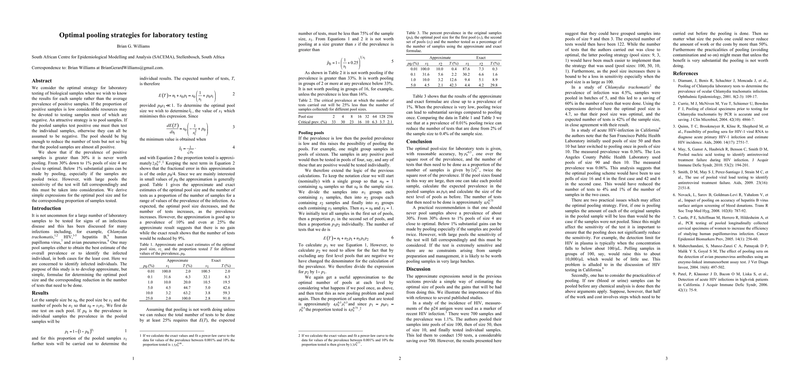 We consider the optimal strategy for laboratory testing of biological samples when we wish to know the results for each sample rather than the average prevalence of positive samples. If the proportion of positive samples is low considerable resources may be devoted to testing samples most of which are negative. An attractive strategy is to pool samples. If the pooled samples test positive one must then test the individual samples, otherwise they can all be assumed to be negative. The pool should be big enough to reduce the number of tests but not so big that the pooled samples are almost all positive. We show that if the prevalence of positive samples is greater than 30% it is never worth pooling. From 30% down to 1% pools of size 4 are close to optimal. Below 1% substantial gains can be made by pooling, especially if the samples are pooled twice. However, with large pools the sensitivity of the test will fall correspondingly and this must be taken into consideration. We derive simple expressions for the optimal pool size and for the corresponding proportion of samples tested.