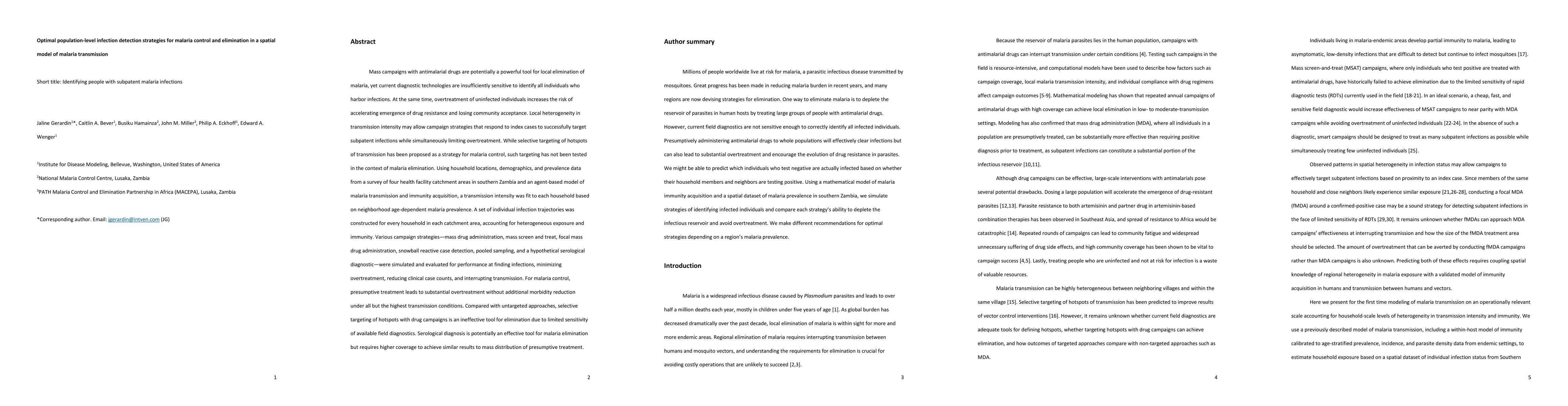 This paper evaluates various malaria elimination strategies using a spatial model, finding that mass drug administration and presumptive treatment lead to significant overtreatment without substantial benefits. Selective targeting of hotspots is ineffective due to diagnostic limitations, highlighting the need for improved diagnostic tools to achieve elimination.
