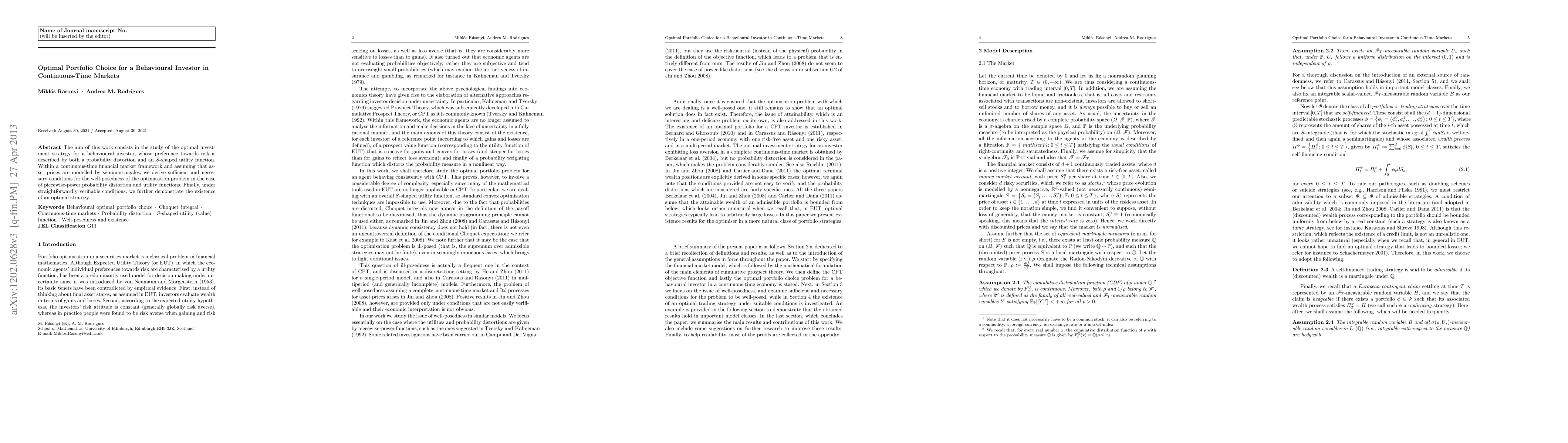 The aim of this work consists in the study of the optimal investment strategy for a behavioural investor, whose preference towards risk is described by both a probability distortion and an S-shaped utility function. Within a continuous-time financial market framework and assuming that asset prices are modelled by semimartingales, we derive sufficient and necessary conditions for the well-posedness of the optimisation problem in the case of piecewise-power probability distortion and utility functions. Finally, under straightforwardly verifiable conditions, we further demonstrate the existence of an optimal strategy.