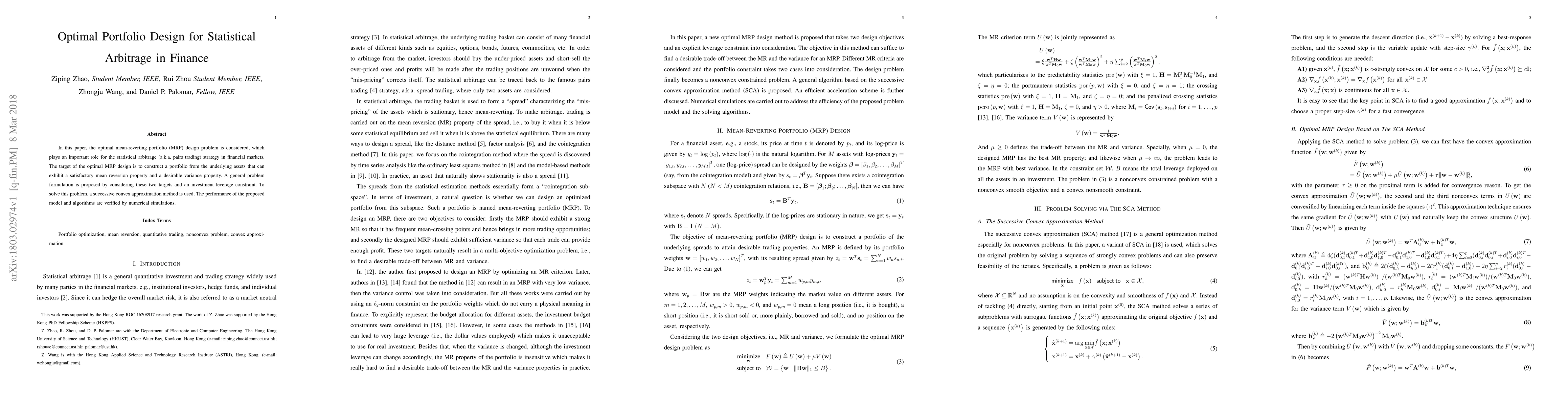In this paper, the optimal mean-reverting portfolio (MRP) design problem is considered, which plays an important role for the statistical arbitrage (a.k.a. pairs trading) strategy in financial markets. The target of the optimal MRP design is to construct a portfolio from the underlying assets that can exhibit a satisfactory mean reversion property and a desirable variance property. A general problem formulation is proposed by considering these two targets and an investment leverage constraint. To solve this problem, a successive convex approximation method is used. The performance of the proposed model and algorithms are verified by numerical simulations.
