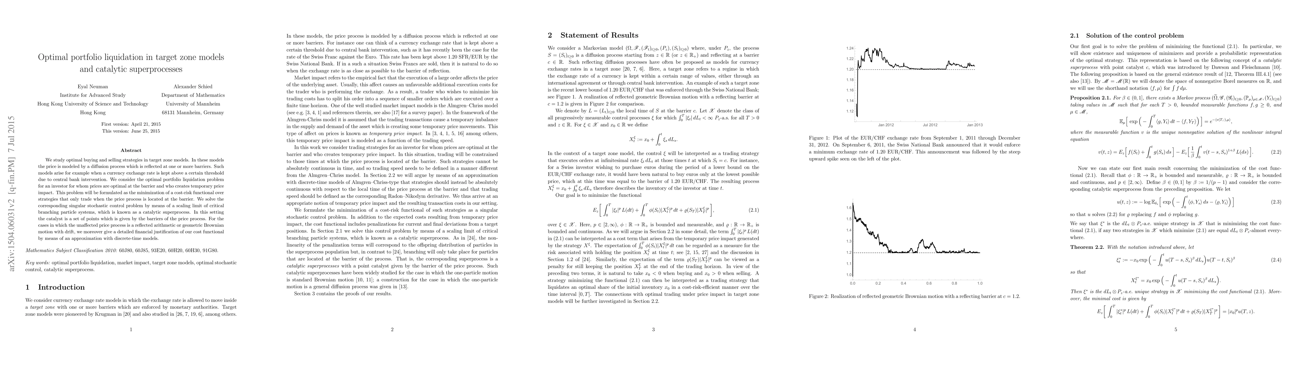 This paper investigates optimal liquidation strategies in target zone models where prices reflect barriers, relevant for currency exchange rates under central bank intervention. The authors solve the singular stochastic control problem using catalytic superprocesses, providing a detailed financial justification for their cost-risk functional through discrete-time model approximations.