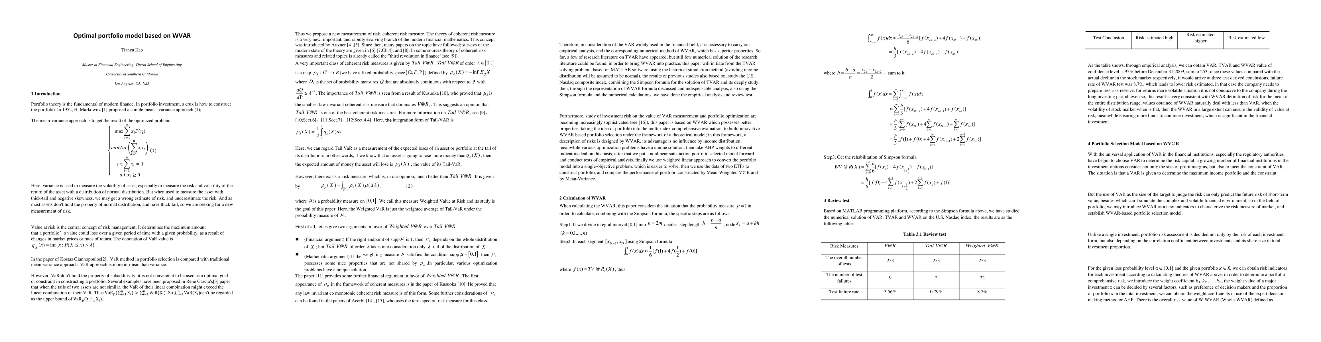 This article is focused on using a new measurement of risk-- Weighted Value at Risk to develop a new method of constructing initiate from the TVAR solving problem, based on MATLAB software, using the historical simulation method (avoiding income distribution will be assumed to be normal), the results of previous studies also based on, study the U.S. Nasdaq composite index, combining the Simpson formula for the solution of TVAR and its deeply study; then, through the representation of WVAR formula discussed and indispensable analysis, also using the Simpson formula and the numerical calculations, we have done the empirical analysis and review test. this paper is based on WVAR which possesses better properties, taking the idea of portfolio into the multi-index comprehensive evaluation, to build innovative WVAR based portfolio selection under the framework of a theoretical model; in this framework, a description of risks is designed by WVAR, its advantage is no influence by income distribution, meanwhile various optimization problems have a unique solution; then take AHP weights to different indicators deal on this basis, after that we put a nonlinear satisfaction portfolio selected model forward and conduct tests of empirical analysis, finally we use weighted linear approach to convert the portfolio model into a single-objective problem, which is easier to solve, then we use the data of two ETFs to construct portfolio, and compare the performance of portfolio constructed by Mean-Weighted V@R and by Mean-Variance.