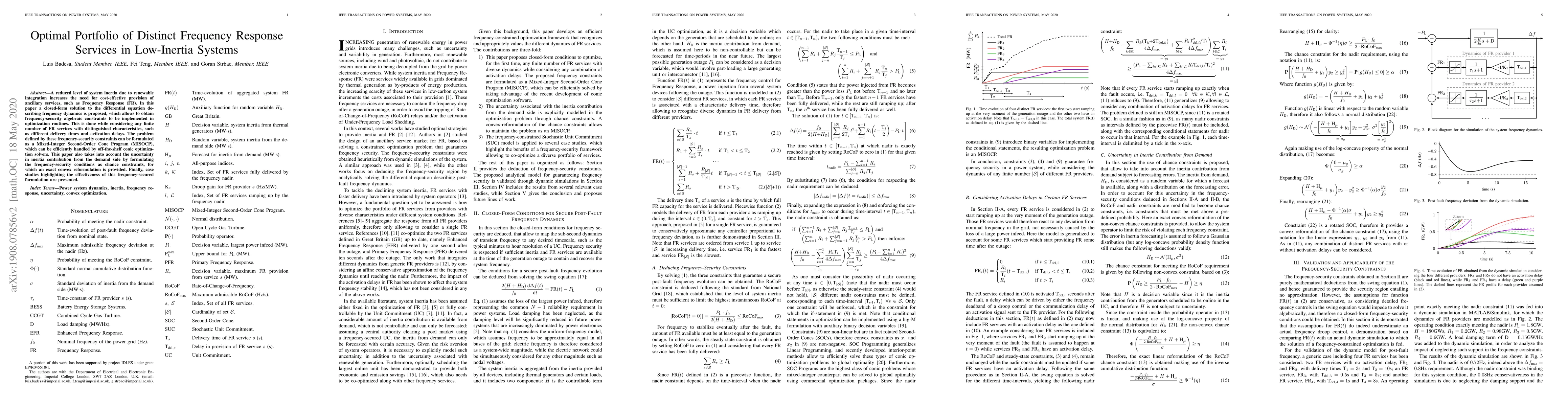 This paper proposes a closed-form solution for frequency dynamics in low-inertia systems, formulating the optimal portfolio of distinct frequency-response services as a Mixed-Integer Second-Order Cone Program (MISOCP) to ensure frequency security, considering service characteristics and demand-side inertia uncertainty through chance constraints. Case studies demonstrate the effectiveness of the proposed frequency-secured optimization approach.