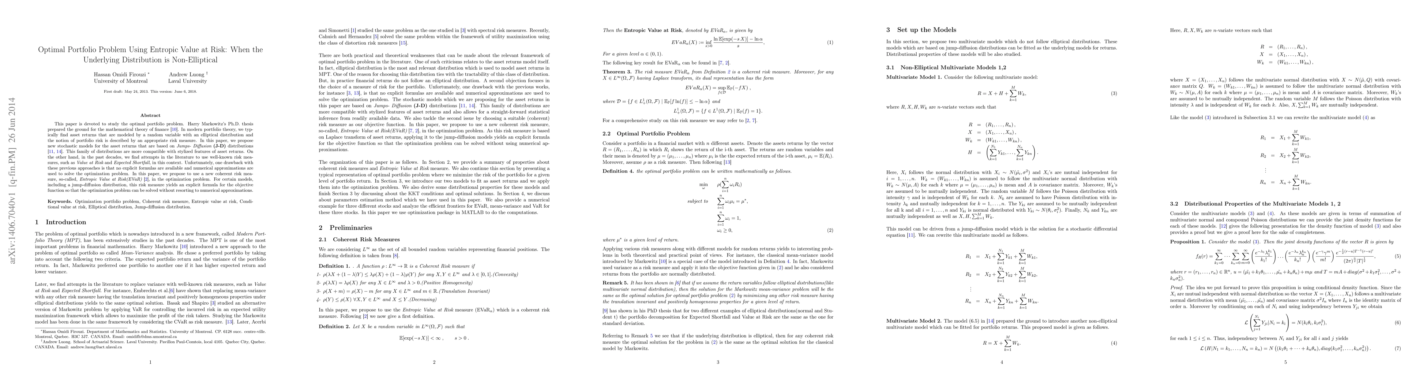 The paper introduces Entropic Value at Risk (EVaR) as a novel coherent risk measure and provides explicit formulas for optimization in Jumps-Diffusion models, which is a significant technical contribution to portfolio optimization under non-elliptical distributions.