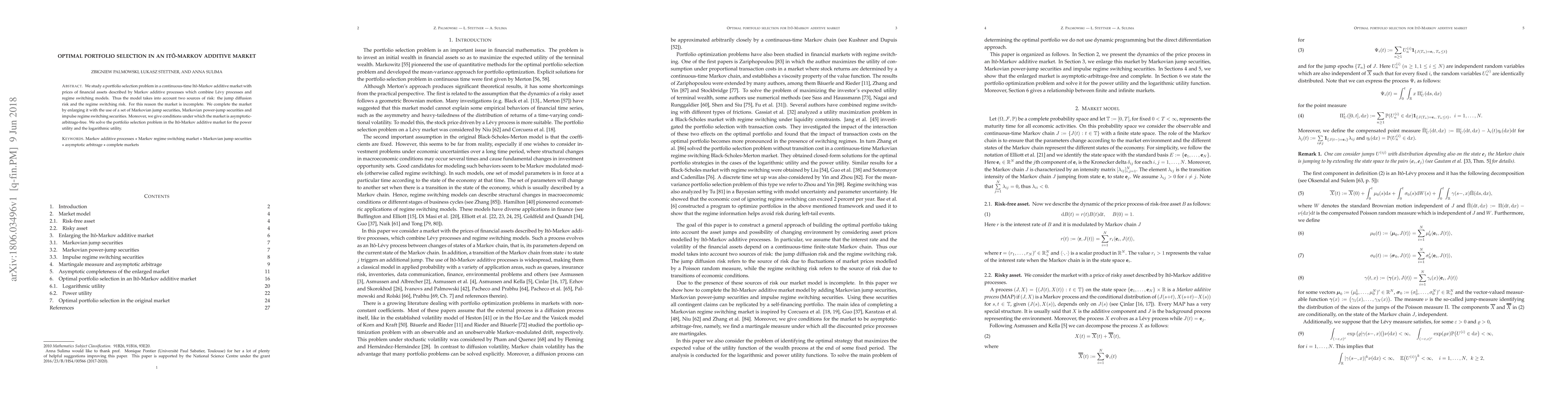 This paper explores optimal portfolio selection in a continuous-time Itô-Markov additive market, addressing both jump diffusion and regime switching risks. The market is completed using additional securities, ensuring it is asymptotic-arbitrage-free, and the optimal portfolio is determined for both power and logarithmic utility functions.