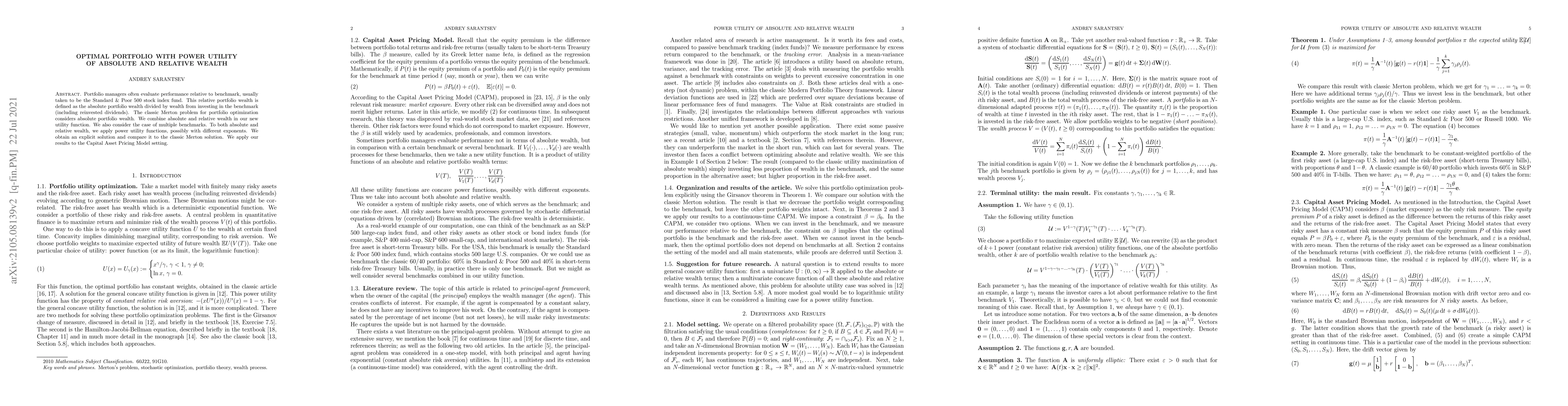 Portfolio managers often evaluate performance relative to benchmark, usually taken to be the Standard & Poor 500 stock index fund. This relative portfolio wealth is defined as the absolute portfolio wealth divided by wealth from investing in the benchmark (including reinvested dividends). The classic Merton problem for portfolio optimization considers absolute portfolio wealth. We combine absolute and relative wealth in our new utility function. We also consider the case of multiple benchmarks. To both absolute and relative wealth, we apply power utility functions, possibly with different exponents. We obtain an explicit solution and compare it to the classic Merton solution. We apply our results to the Capital Asset Pricing Model setting.