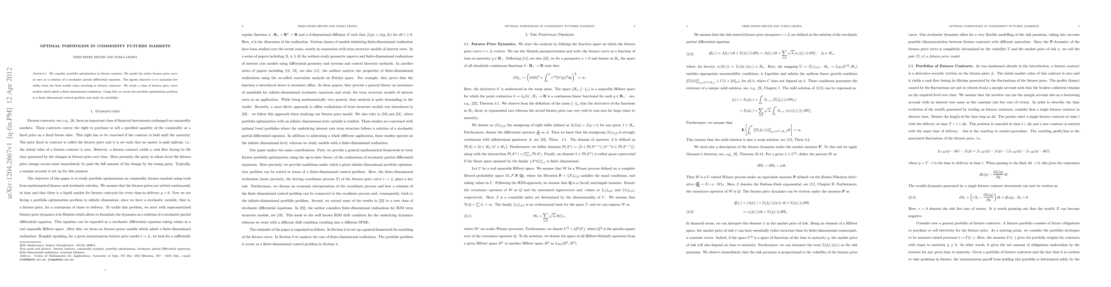 This paper explores portfolio optimization in futures markets by modeling the entire futures price curve through a stochastic partial differential equation. The authors recast the optimization problem as a finite-dimensional control problem to maximize utility from final wealth, studying its solvability.