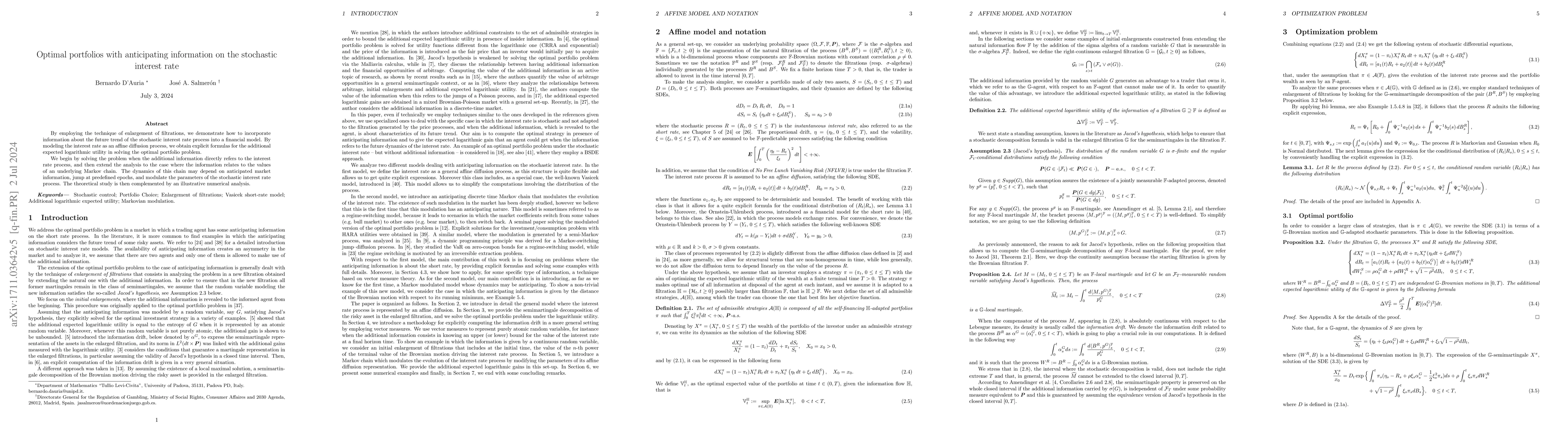 This paper uses filtration enlargement techniques to integrate future stochastic interest rate trends into financial modeling, deriving explicit formulas for optimal portfolio solutions. It applies these methods to scenarios where information is derived from both direct interest rate trends and an underlying Markov chain modulated by anticipated market information, followed by a numerical analysis to support the theoretical findings.