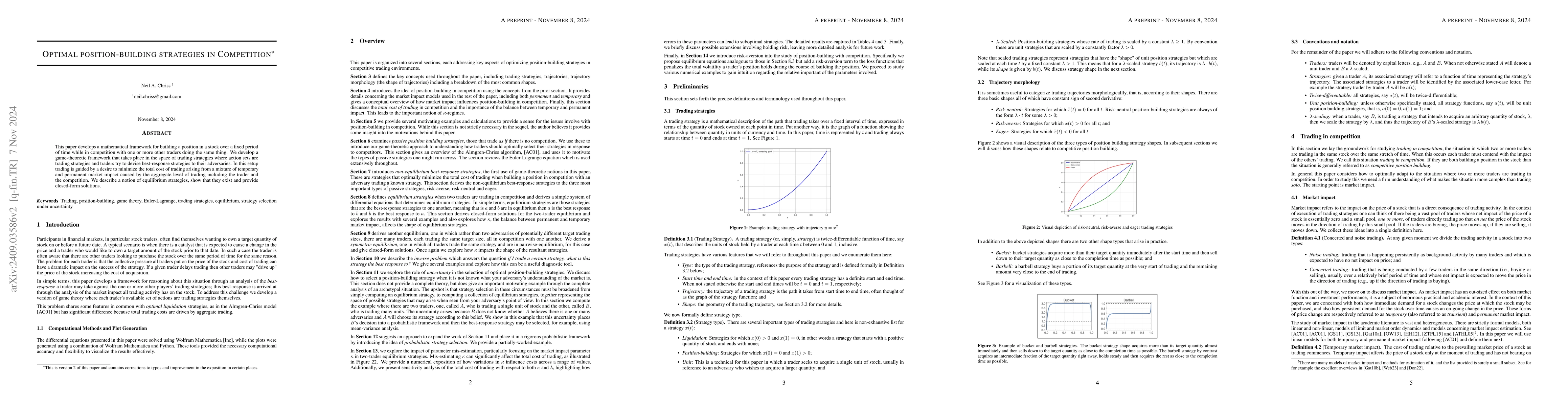 This paper develops a mathematical framework for building a position in a stock over a fixed period of time while in competition with one or more other traders doing the same thing. We develop a game-theoretic framework that takes place in the space of trading strategies where action sets are trading strategies and traders try to devise best-response strategies to their adversaries. In this setup trading is guided by a desire to minimize the total cost of trading arising from a mixture of temporary and permanent market impact caused by the aggregate level of trading including the trader and the competition. We describe a notion of equilibrium strategies, show that they exist and provide closed-form solutions.