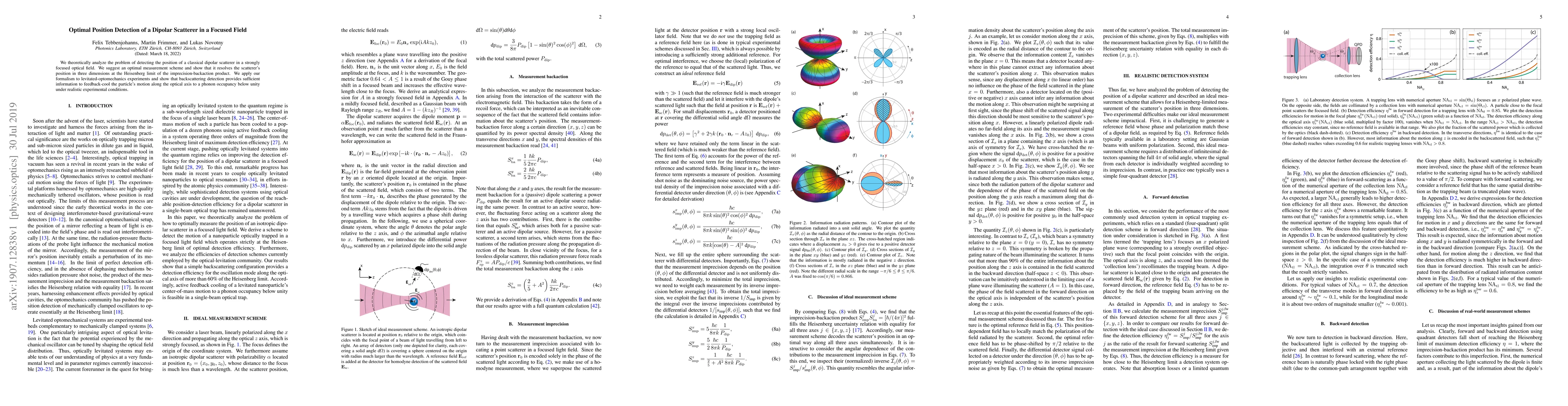This paper proposes an optimal measurement scheme for detecting the position of a dipolar scatterer in a focused optical field, achieving the Heisenberg limit of precision. The method is applied to levitated-optomechanics experiments, demonstrating that backscattering detection can sufficiently cool the particle's motion to sub-phonon levels.