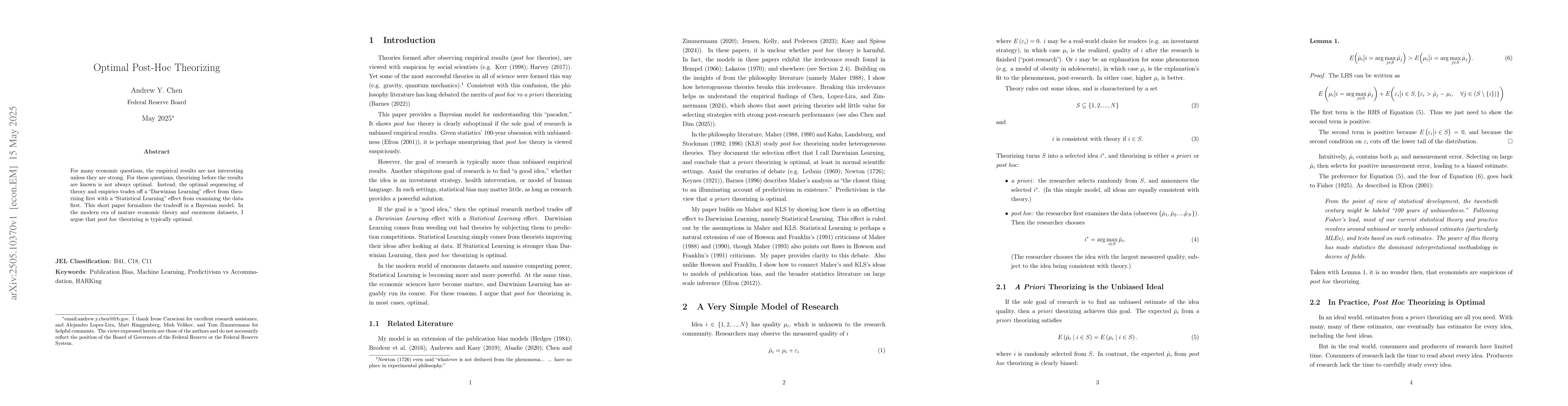 The research introduces a novel perspective on the sequencing of theory and empirics, arguing for the optimality of post hoc theorizing in contemporary economic research.