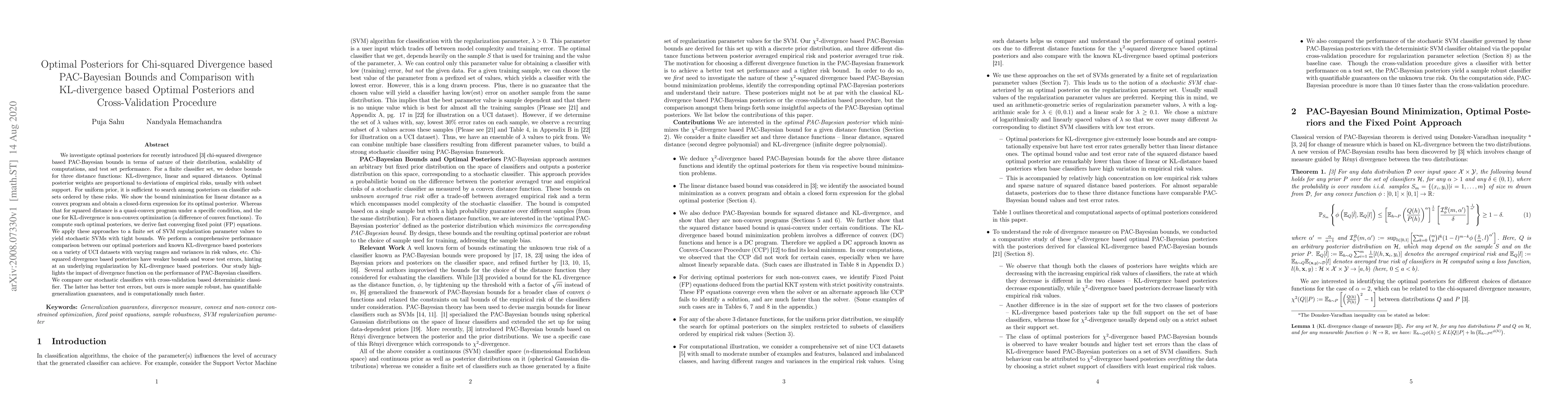 This paper explores optimal posteriors for chi-squared divergence based PAC-Bayesian bounds, deriving closed-form and quasi-convex solutions for different distance functions. It compares these with KL-divergence based posteriors and finds that chi-squared divergence posteriors yield weaker bounds and worse test errors, while stochastic classifiers with chi-squared divergence are more sample-robust and computationally faster than cross-validation based classifiers.