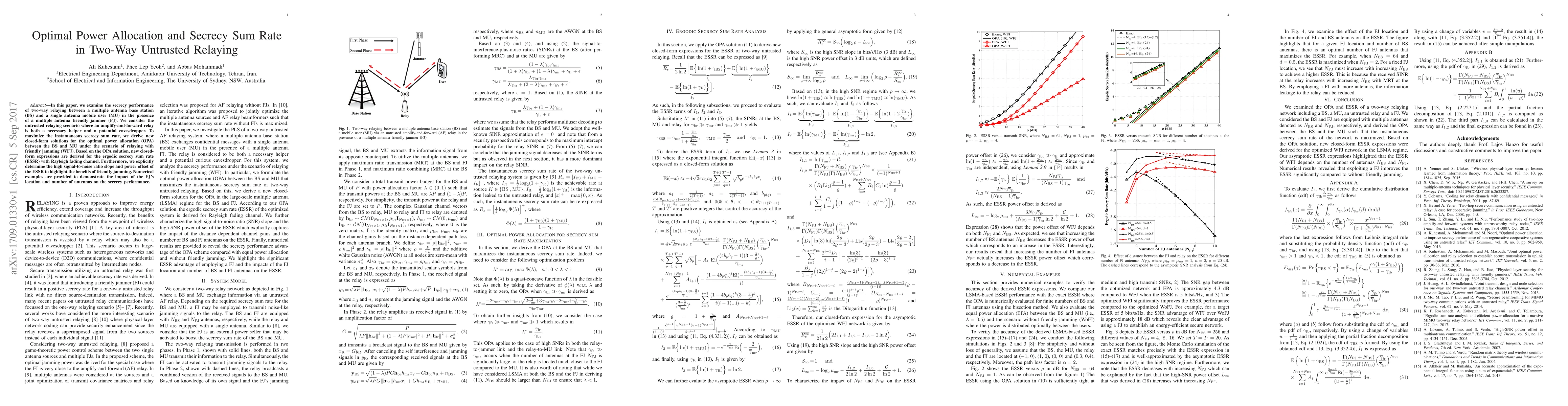 This paper investigates the secrecy performance in two-way relaying with an untrusted amplify-and-forward relay, deriving optimal power allocation solutions to maximize the secrecy sum rate in the presence of a friendly jammer. It provides closed-form expressions for the ergodic secrecy sum rate and analyzes the impact of the jammer's location and antenna count on secrecy performance.