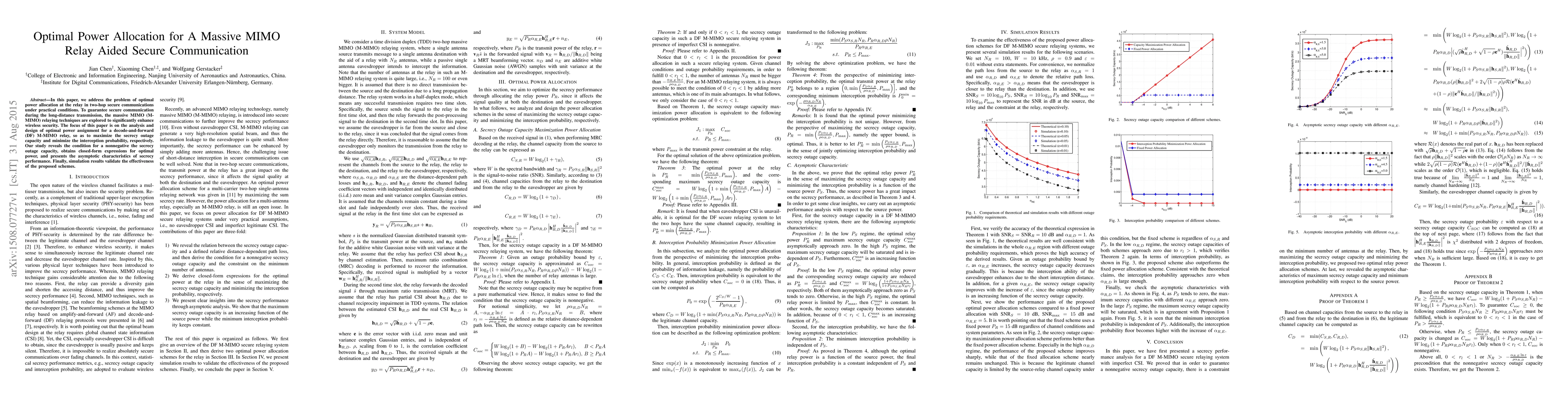 This paper investigates optimal power allocation for a massive MIMO relay in secure two-hop communications to maximize secrecy outage capacity and minimize interception probability. It derives closed-form expressions for optimal power and analyzes the asymptotic characteristics of secrecy performance, validated by simulation results.