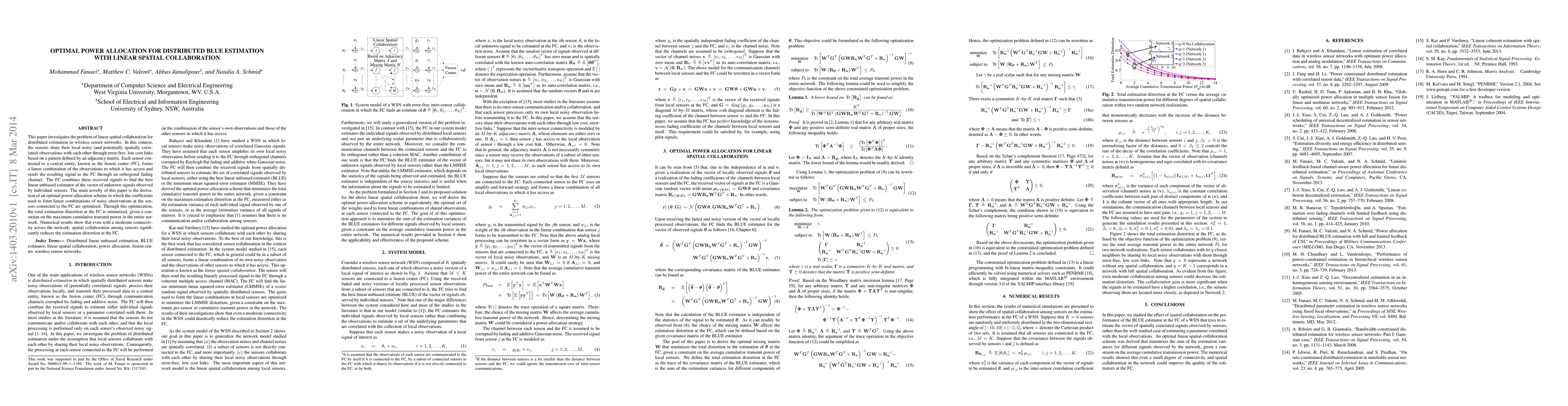 This paper develops an optimal power-allocation scheme for distributed BLUE estimation in wireless sensor networks, optimizing sensor-to-fusion center communication to minimize estimation distortion under power constraints. Numerical results demonstrate significant reduction in estimation distortion through spatial collaboration among sensors.