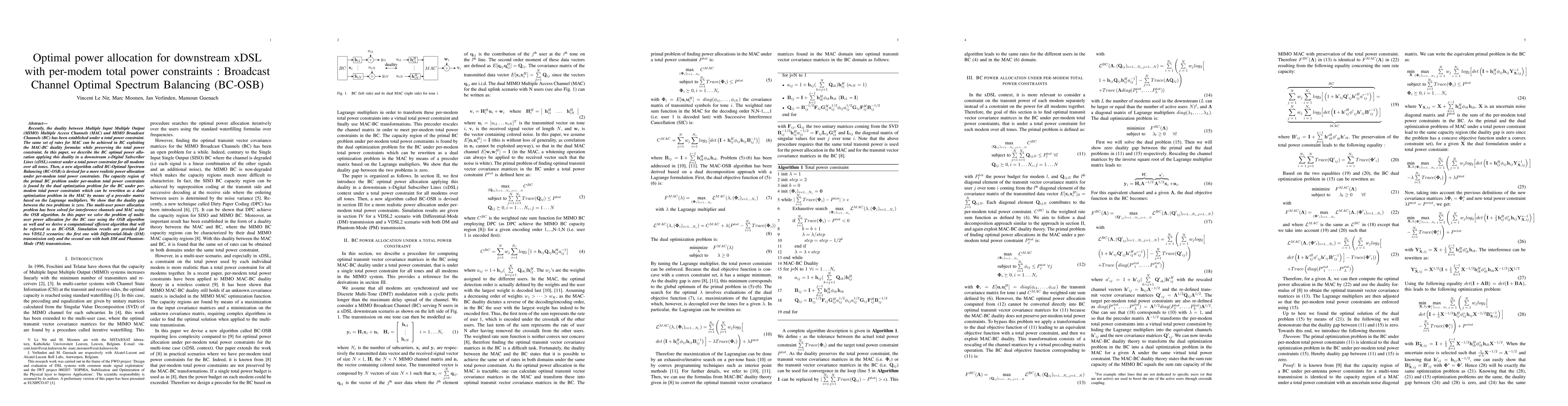 This paper proposes a new algorithm called BC-Optimal Spectrum Balancing (BC-OSB) for optimal power allocation in downstream xDSL systems under per-modem total power constraints. It leverages the duality between MIMO Multiple Access Channels and Broadcast Channels to achieve optimal power allocation, demonstrating zero duality gap and providing computational efficient solutions for multi-user power allocation in VDSL2 scenarios.