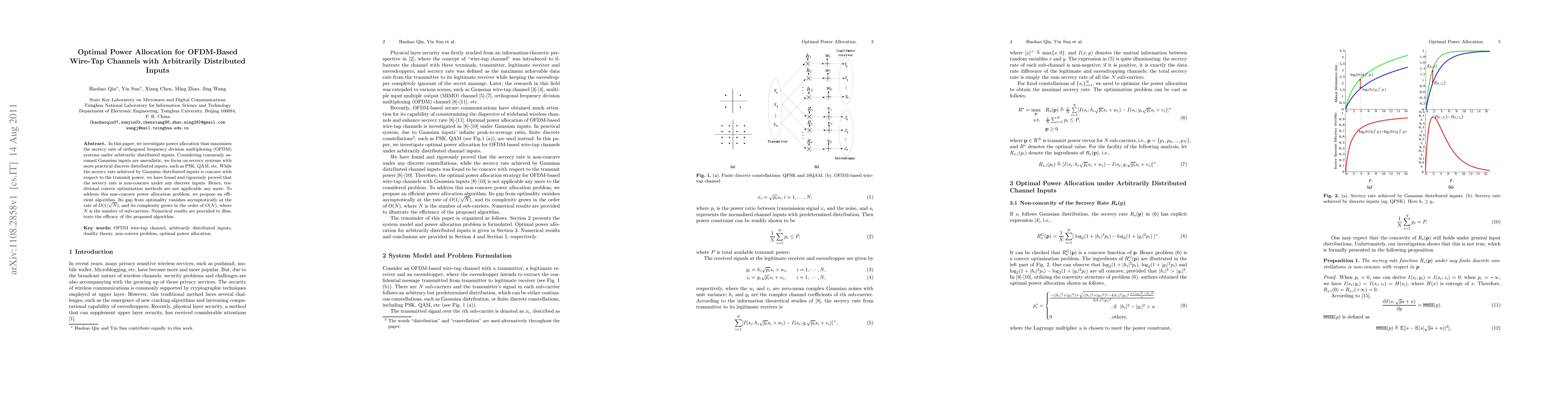 In this paper, we investigate power allocation that maximizes the secrecy rate of orthogonal frequency division multiplexing (OFDM) systems under arbitrarily distributed inputs. Considering commonly assumed Gaussian inputs are unrealistic, we focus on secrecy systems with more practical discrete distributed inputs, such as PSK, QAM, etc. While the secrecy rate achieved by Gaussian distributed inputs is concave with respect to the transmit power, we have found and rigorously proved that the secrecy rate is non-concave under any discrete inputs. Hence, traditional convex optimization methods are not applicable any more. To address this non-concave power allocation problem, we propose an efficient algorithm. Its gap from optimality vanishes asymptotically at the rate of $O(1/\sqrt{N})$, and its complexity grows in the order of O(N), where $N$ is the number of sub-carriers. Numerical results are provided to illustrate the efficacy of the proposed algorithm.