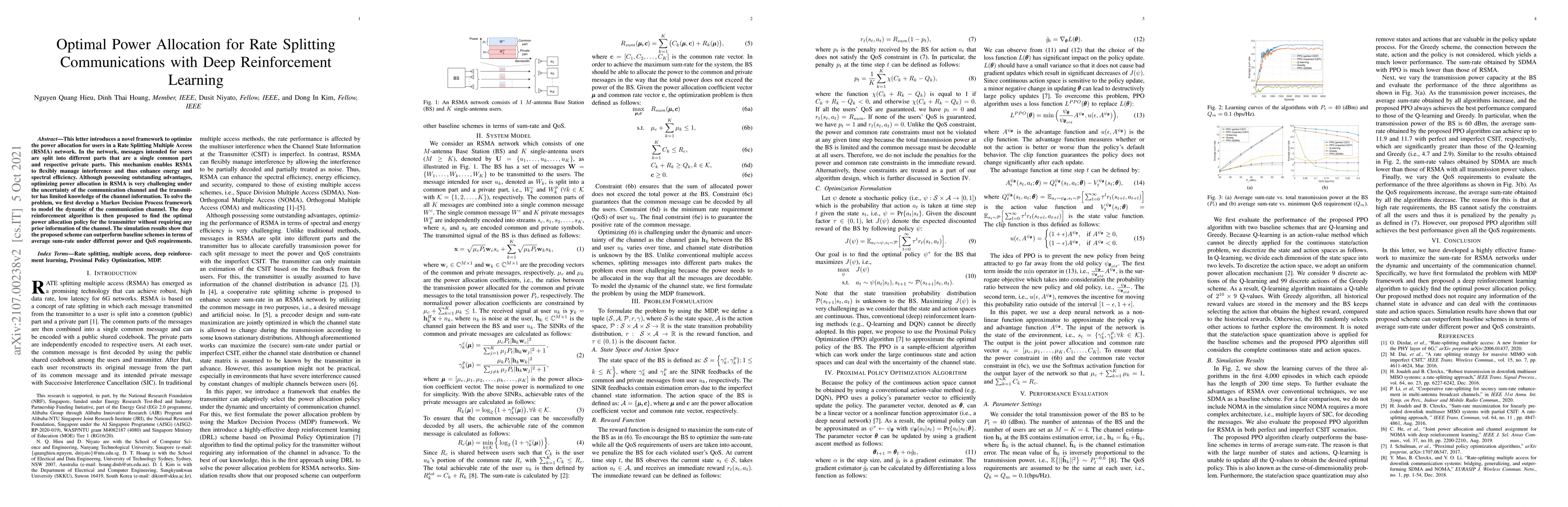 This paper presents a new method using deep reinforcement learning to optimize power allocation in Rate Splitting Multiple Access (RSMA) networks. The approach, which models channel dynamics as a Markov Decision Process, outperforms baseline schemes in improving average sum-rate under various power and quality-of-service conditions without needing prior channel information.