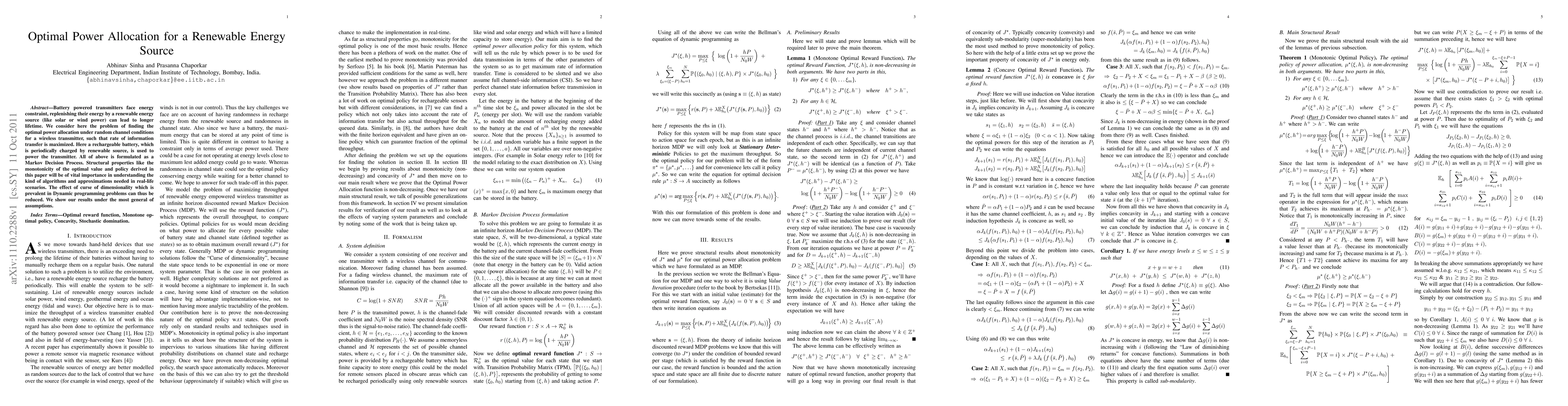 Battery powered transmitters face energy constraint, replenishing their energy by a renewable energy source (like solar or wind power) can lead to longer lifetime. We consider here the problem of finding the optimal power allocation under random channel conditions for a wireless transmitter, such that rate of information transfer is maximized. Here a rechargeable battery, which is periodically charged by renewable source, is used to power the transmitter. All of above is formulated as a Markov Decision Process. Structural properties like the monotonicity of the optimal value and policy derived in this paper will be of vital importance in understanding the kind of algorithms and approximations needed in real-life scenarios. The effect of curse of dimensionality which is prevalent in Dynamic programming problems can thus be reduced. We show our results under the most general of assumptions.