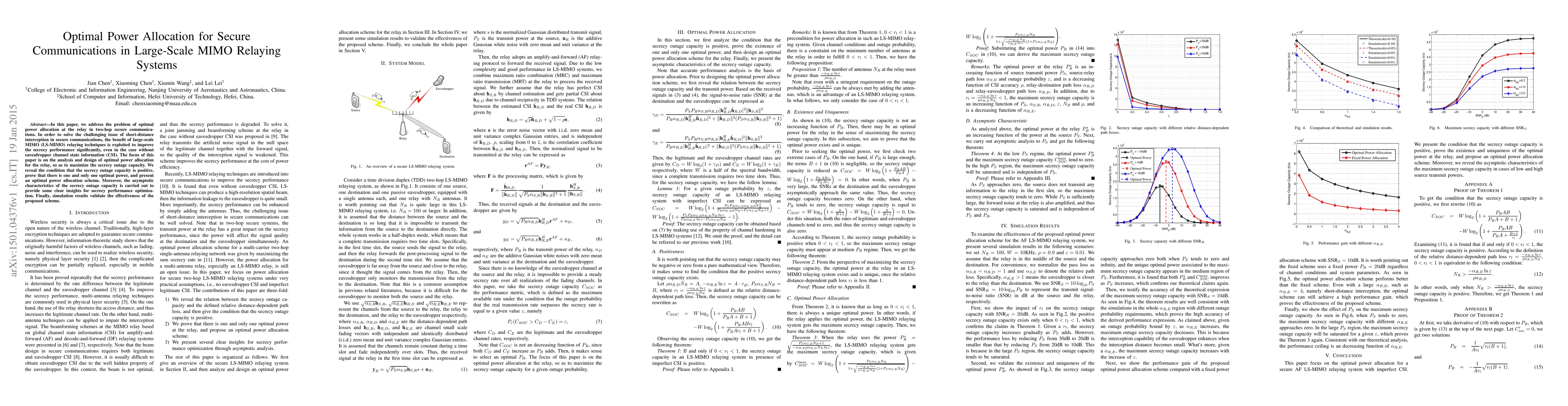 This paper proposes an optimal power allocation strategy for secure communications in large-scale MIMO relaying systems to maximize secrecy outage capacity, addressing short-distance interception without eavesdropper channel state information. The study reveals the existence of a unique optimal power and validates the proposed scheme through simulations.