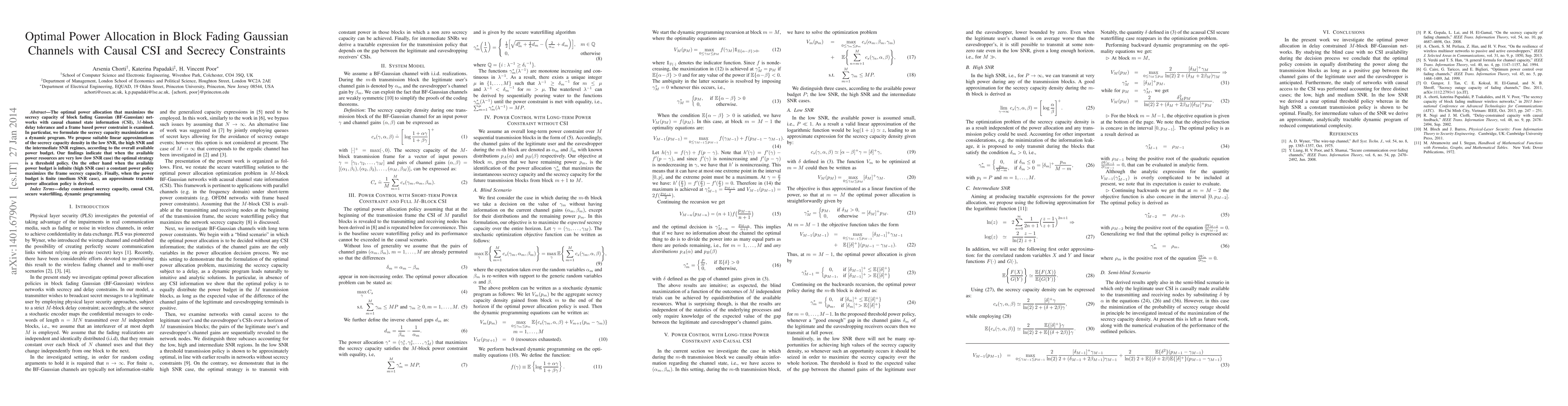 This paper investigates optimal power allocation strategies to maximize secrecy capacity in block fading Gaussian channels under causal CSI, M-block delay, and frame-based power constraints. It proposes dynamic programming and linear approximations for low, high, and medium SNR regimes, revealing threshold, constant, and approximate policies respectively.