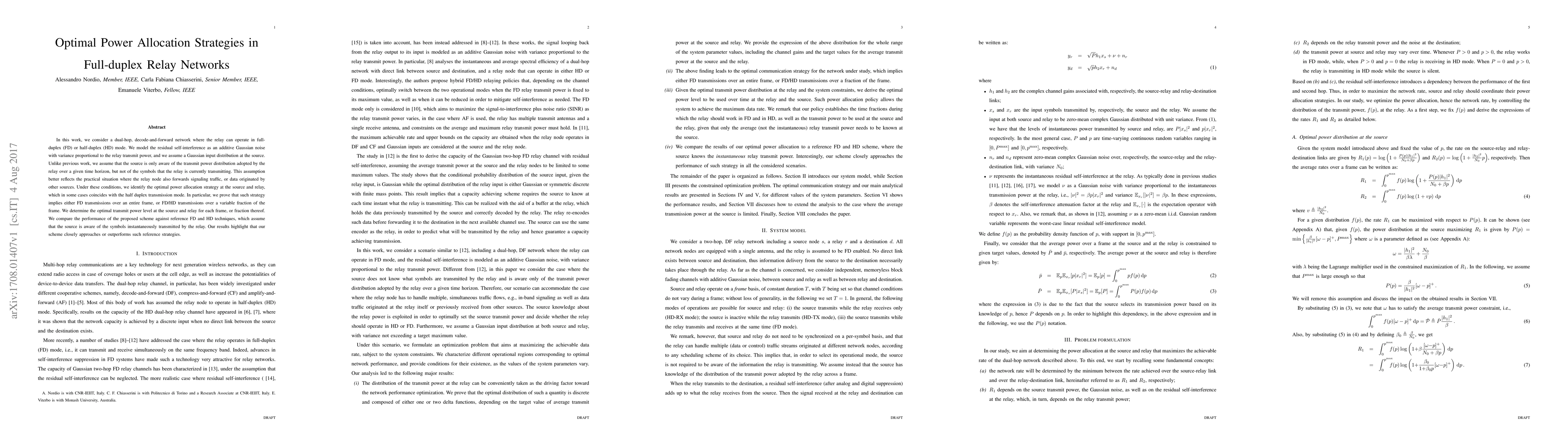 In this work, we consider a dual-hop, decode-and-forward network where the relay can operate in full- duplex (FD) or half-duplex (HD) mode. We model the residual self-interference as an additive Gaussian noise with variance proportional to the relay transmit power, and we assume a Gaussian input distribution at the source. Unlike previous work, we assume that the source is only aware of the transmit power distribution adopted by the relay over a given time horizon, but not of the symbols that the relay is currently transmitting. This assumption better reflects the practical situation where the relay node also forwards signaling traffic, or data originated by other sources. Under these conditions, we identify the optimal power allocation strategy at the source and relay, which in some cases coincides with the half duplex transmission mode. In particular, we prove that such strategy implies either FD transmissions over an entire frame, or FD/HD transmissions over a variable fraction of the frame. We determine the optimal transmit power level at the source and relay for each frame, or fraction thereof. We compare the performance of the proposed scheme against reference FD and HD techniques, which assume that the source is aware of the symbols instantaneously transmitted by the relay. Our results highlight that our scheme closely approaches or outperforms such reference strategies.